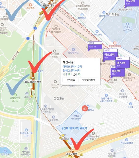 성산시영을 중심으로 놓고 보면 6호선 3개나 끼고 있습니다. 월드컵 경기장에는 홈플러스와 각종 편의시설이 있어서 웬만한 것들이 해결 가능합니다. DMC업무지구 직주근접이기도 하고요