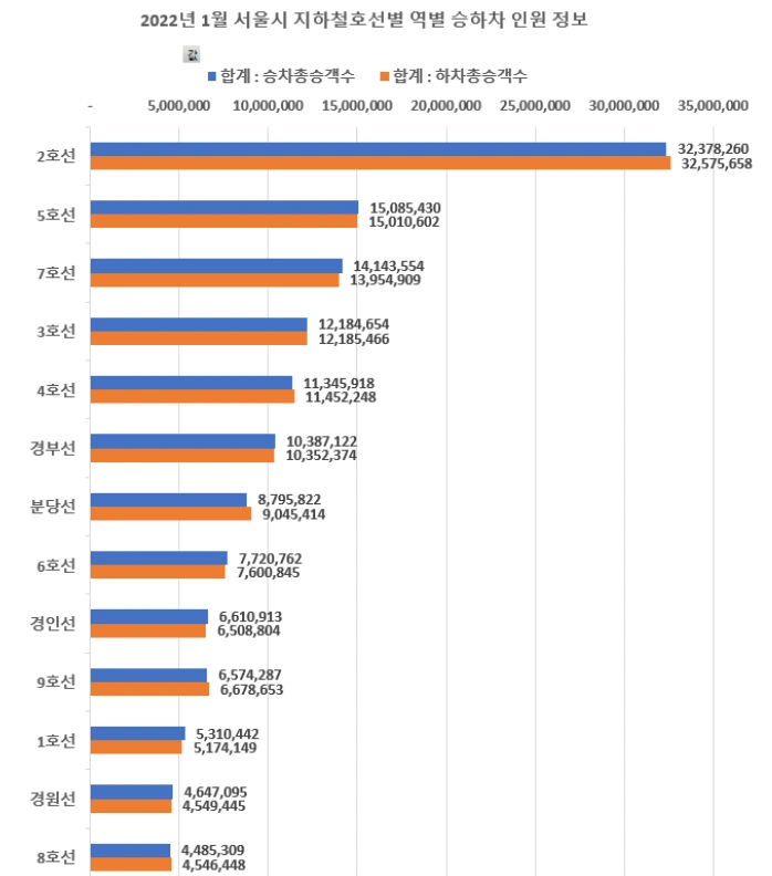 2호선의 승하차 승객수의 압도적인 숫자가 보이시나요? 22년 1월 승하차 인원이 6천4백만 명입니다.