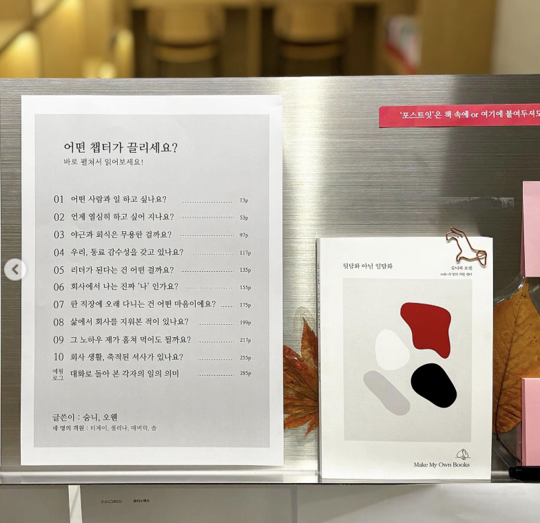사실, 책 만들기 프로젝트가 아닌 '일의 의미'를 찾고자 시작했던 프로젝트였는데, 목적도 1000% 달성하긴 했습니다. '나는 이런 일을 좋아하는구나. 이런 사람들이랑 일할 때 열심히 하고 싶구나. 앞으로 나는 이런 일을 해야 하는 사람이구나.' 등등.. 막연했던 저만의 일의 의미가 굉장히 선명해졌어요.