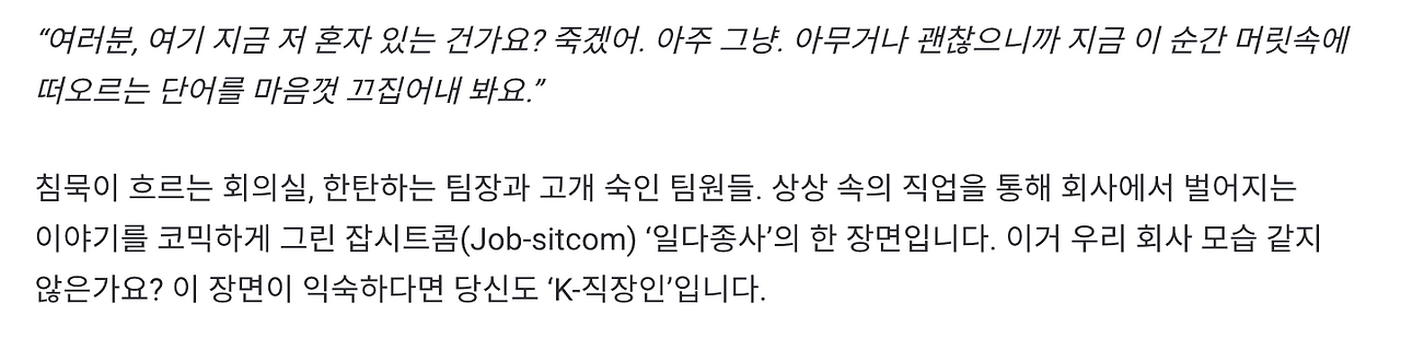 야근에 대한 이야기를 할 때 꼭 언급되는 게 ‘회의’와 ‘보고’죠. 무의미한 회의와 보고만 줄여도 퇴근시간을 당길 수 있다는 기사들이 심심찮게 보여요. 애초에 모두가 무의미하다고 생각하고 ‘이 회의하지 맙시다’, ‘옳소! 옳소!’ 이야기했으면 이런 불만이 없었을 텐데, 아마 미팅룸에 모인 누군가는 의미 있다고 생각하고, 누군가는 무의미하다고 생각해서 그런 거겠죠? 선뜻 이 회의의 무용성을 단정 지을 수 없으니 속시원히 터놓고 이야기하기 어려운 주제가 분명하네요.