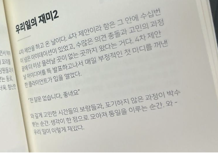 선배에게 들었던 우리 업의 정의를 다시 떠올려볼게요. ‘명확한 목표가 있고, 브랜드가 하고 싶은 이야기를 소비자가 듣고 싶은 이야기로 바꿔주는 일’. 이 말은 취향의 영역이 아닌 설득의 영역이라는 말이기도 해요. 이 아이디어가 너무 도전적일 수 있지만 이 브랜드가 돋보이려면 꼭 필요한 방법일 수 있고, 클라이언트가 선뜻 사기 어렵다면 살 수 있는 요소들을 보강하면 되죠. 설득의 근거들을 모으고, 혹 할만한 것들을 보여줘야죠. 이 목표에 가려면 이게 최선의 방법이라고 믿게 해야죠. 모두가 반대했는데 내가 믿고 끝까지 설득해서 팔리잖아요? 그 기쁨이야말로 한 3년 가는 연료가 될 거예요 더욱이, 이 과정을 팀과 함께 치열하게 토론하면서 함께 만들어간다면 우리의 성취라 기쁨은 배가 될 것 같고요.