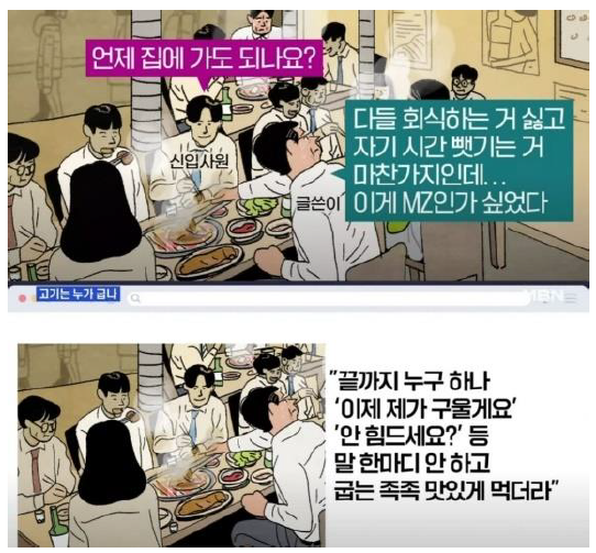 마지막으로는 회식을 인성 테스트라는 평가항목으로 저연차를 바라보는 시간이 되어서는 안 된다고 생각해요. SNS에서 'MZ사원 진짜 고기를 안 굽네요?"라는 글을 심심치 않게 볼 수 있어요. 저는 이런 글을 볼 때마다 긴장이 되곤 합니다. '혹시 나는 회식을 하면서 저런 실수를 한 적이 없나...? 아버지가 소주는 무조건 오른손으로 따르라고 하셨는데요. 왼손잡이인 내가 습관적으로 왼손으로 따라드린 적이 있나?' 와 같이 지난 회식을 복기해 보기도 하죠.