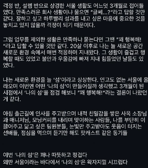 그 글에는 저의 기억과 전혀 다른 감정의 기록이 담겨있었어요. 저는 지금껏 인턴시절 저를 불안하게 만들었던 원인이 회사에 있다고 생각해 왔어요. 하지만 낯선 회사, 그리고 회사에서 만나는 낯선이 들은 오히려 서울이라는 드넓은 바다에서 저를 지켜주고 또 쉬어 갈 수 있게 만들어주는 존재였더라고요.