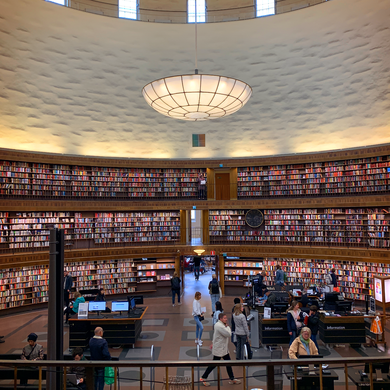 사방이 책으로 가득한 원통형 디자인을 실제로 마주하니 감탄이 절로 나왔다. 빽빽하게 꽂힌 책들을 허 계단으로 올라갈수록 기분이 묘했다. 스웨덴어를 읽을 수 없어서 제목을 알 수 조차 없었지만 마음에 드는 색을 가진 책을 한 권 집어 책장을 넘겨보았다. 이 곳에는 오래되거나 오래되지 않은 다양한 책들이 있고 층마다 혹은 간간히 분류되어있다. 맨 꼭대기 층까지 올라가 반대편 쪽도 둘러보고 나서 이 공간이 얼마나 멋진 곳인지 깨달았다. 나는 평소에 어떤 물건을 색상 별로 정리하는 것을 좋아하는데, 이 도서관에서는 그저 주제로만 분류되어 갖가지의 색상과 크기가 뒤섞인 책들이 빽빽이 꽂혀있는 모습임에도 오히려 예술 같이 보였다. 영어나 스웨덴어를 몰라도 시간적 여유가 있다면 한 권 꺼내어 번역해가며 읽으면 참 재미있는 시간이 될 것 같다.