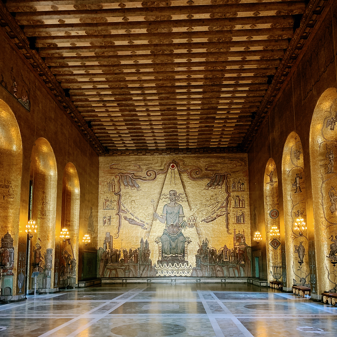 남았다. ‘골든 홀’이라는 이름에 걸맞게 이 공간은 1800만 개의 유리와 금박 모자이크로 그림을 만들었다. 9세기부터 1920년대까지의 스웨덴 역사가 묘사되었다고 한다. 모자이크 그림을 자세히 들여다보면 재미있는 요소가 많기도 하고, 수많은 유리와 금박으로 공간 전체를 그림으로 만든 사람들의 노고가 대단하다고 느껴졌다.