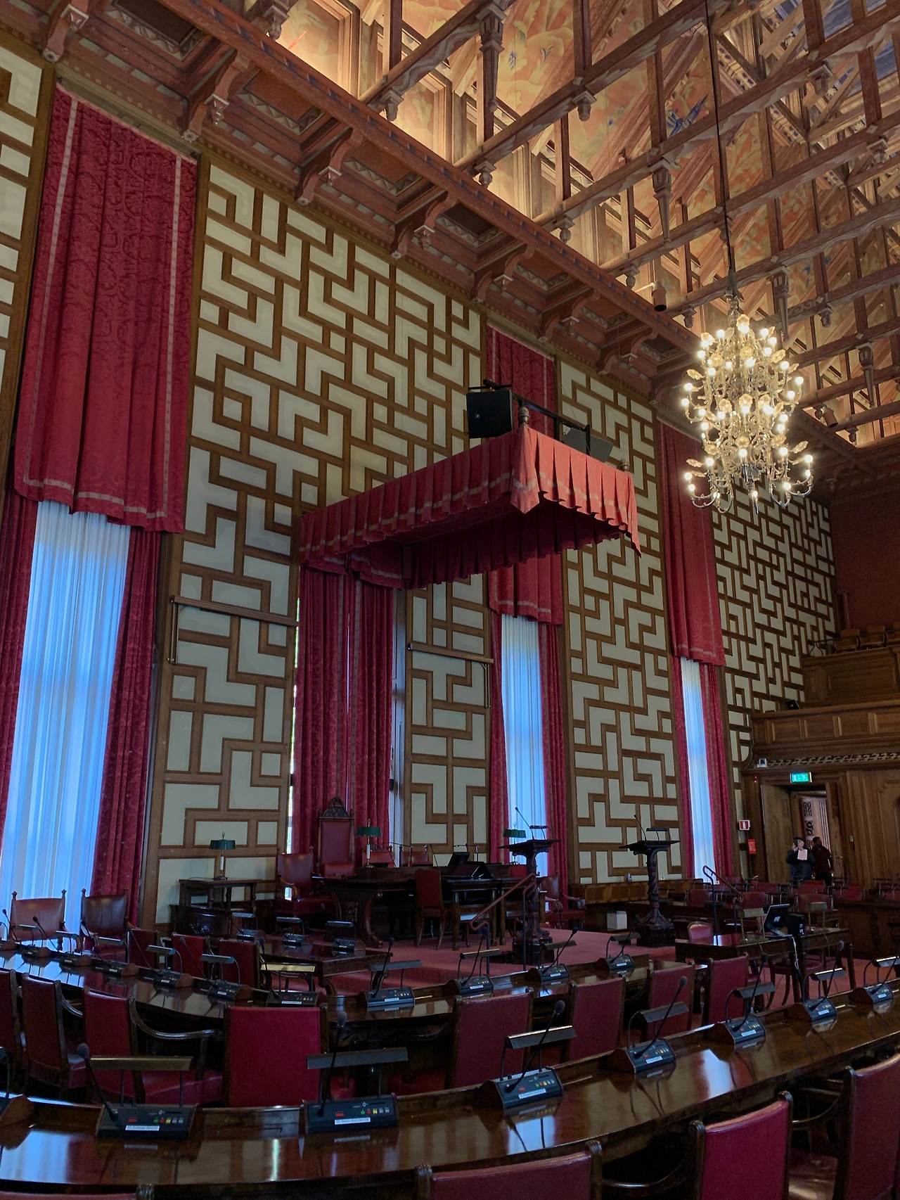 그렇게 가이드와 함께 시청사 곳곳을 들여다보고 사진도 찍을 수 있었다. 내부는 어디든 고급스럽고 각 공간마다 분위기가 달랐다. 또 흥미로운 곳은 ‘대회의실’인데 스톡홀름 시의회 소속인 101명의 의원들이 모여 회의를 진행하는 곳이다. 회의는 방문객들에게도 공개가 된다고 한다. 회의를 직접 볼 수 있다니 신기하기도 하고 그만큼 자신감이 느껴졌다.