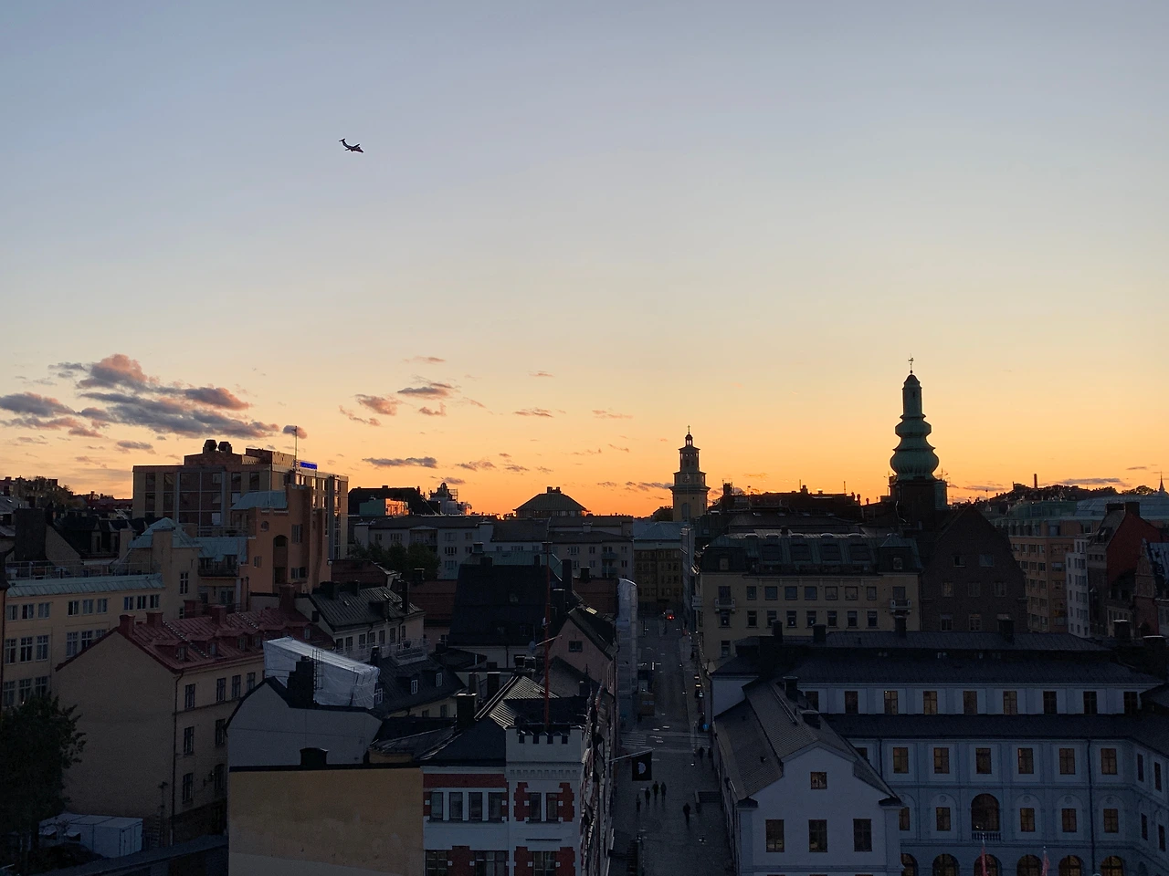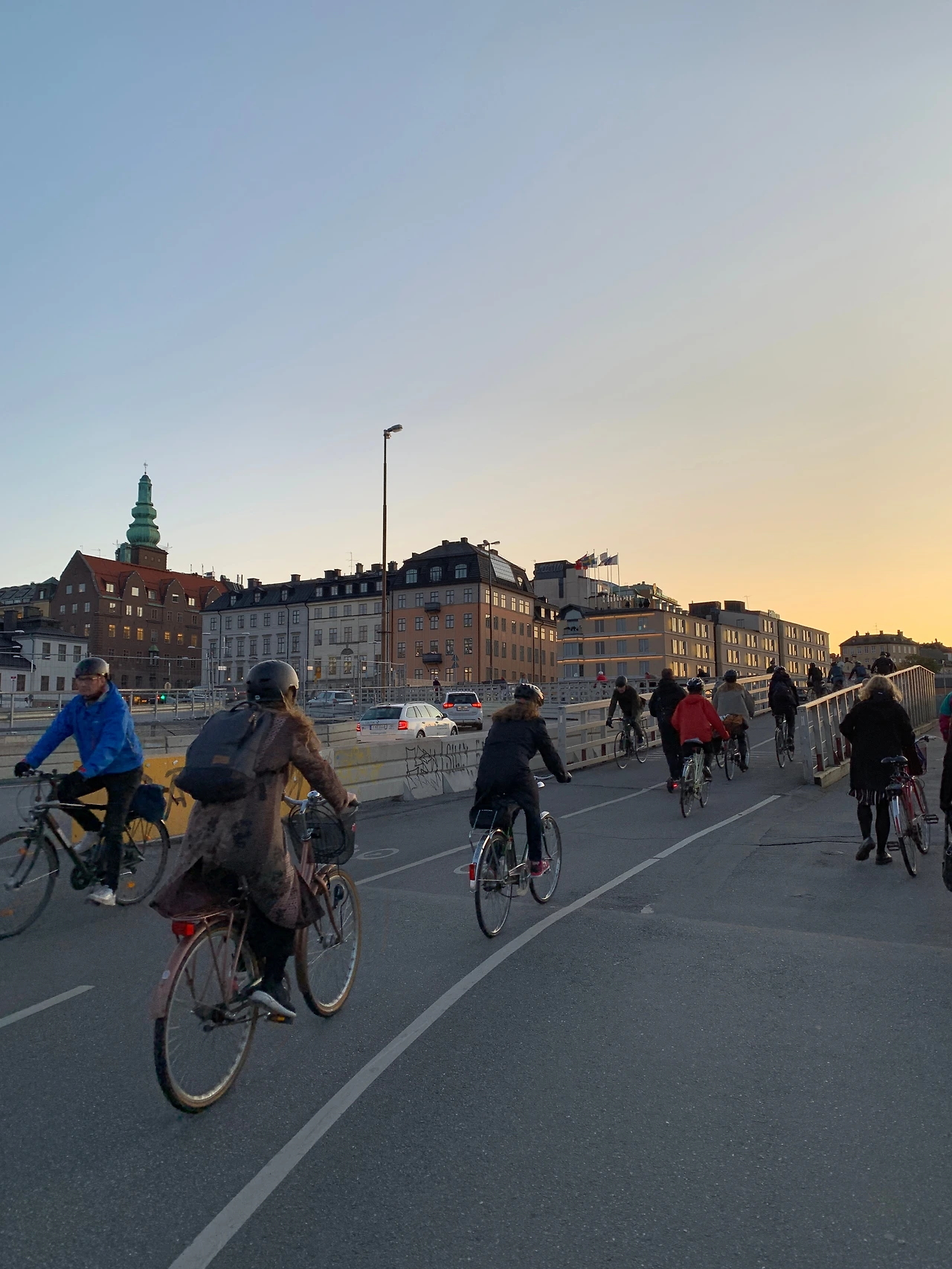 겨우 사람 한두 명 탈 수 있을 정도로 조그마한 수동 엘리베이터를 타고 맨 윗 층으로 올라갔다. 엘리베이터가 워낙 작아서 움직이는 게 왠지 불안했다. 전망대에 도착했지만 근처가 공사 중이라 뷰를 다 망쳤다. 옆으로 피해서 사진을 남기고 붉게 지는 노을을 감상했다. 동쪽과 서쪽이 다른 색으로 물들고 있었다. 바람이 차게 불어 오래 있진 못하고 금방 내려왔다. 감라스탄 쪽으로 걸어가다가 자전거 행렬에 깜짝 놀랐다. 퇴근 시간이라 모두들 자전거를 타고 질주하고 있었다. 자전거를 타고 집에 가는 길이 너무 행복해 보였다. 이렇게 해 질 무렵에 퇴근을 하다니. 한국에서 자영업을 하고 있는 나로서는 상상도 못 할 일이다. 가족들과 저녁 식사를 함께 하는 일을 가장 중요시 여긴다는 스웨덴의 가족 중심 사회는 우리에게 당연하지만 또 당연할 수 없는 것이다.