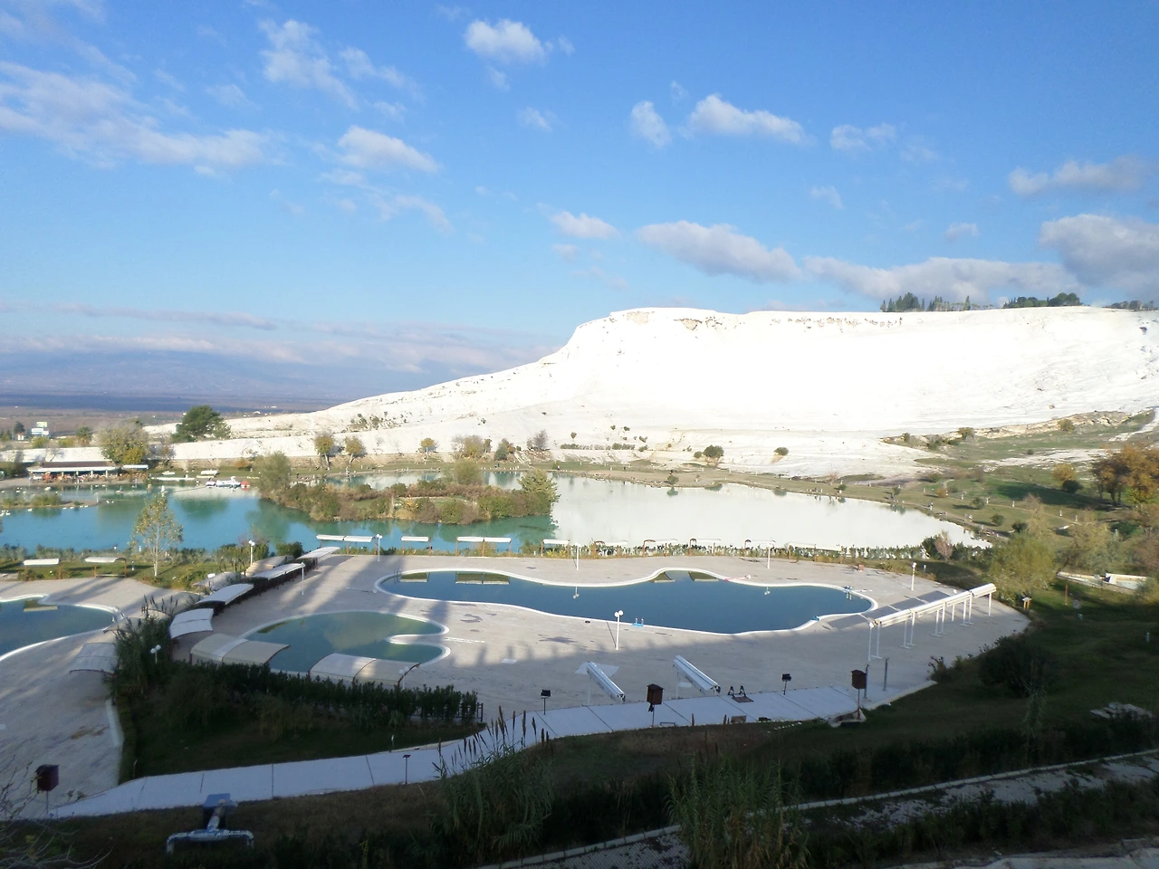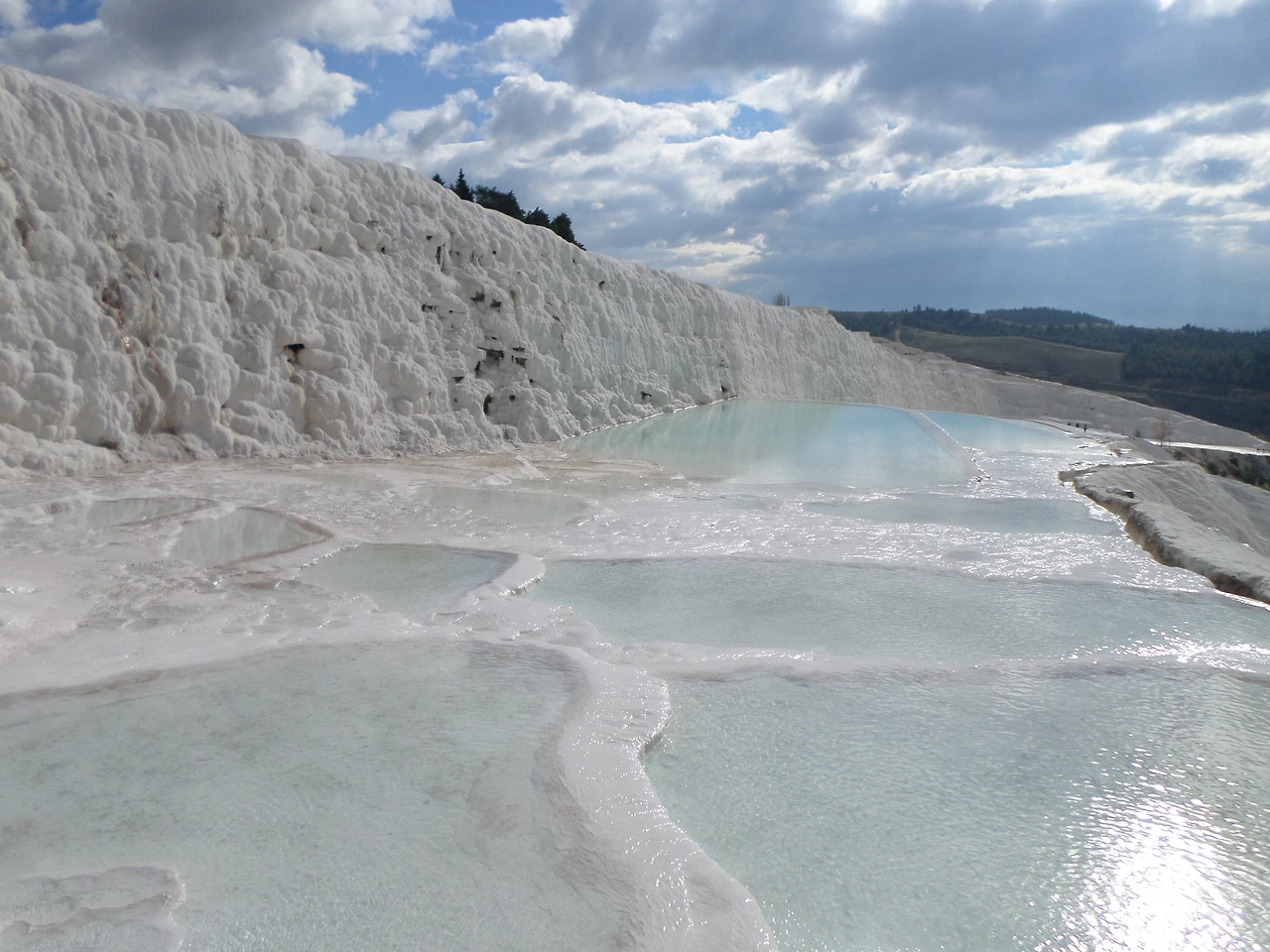 터키의 3대 명소 중 하나인 파묵칼레는 목화의 성이라는 뜻을 지녔다. 새하얀 계단식 다랭이논 같은 모양인데 멀리서 보면 빙산 같기도 하다. 석회층에 고여있는 물이 흘러내리면서 그 성분들이 층을 이뤘고 층마다 푸른 물을 머금고 있다. 맑은 날에 더더욱 청아하게 빛난다고 한다.
