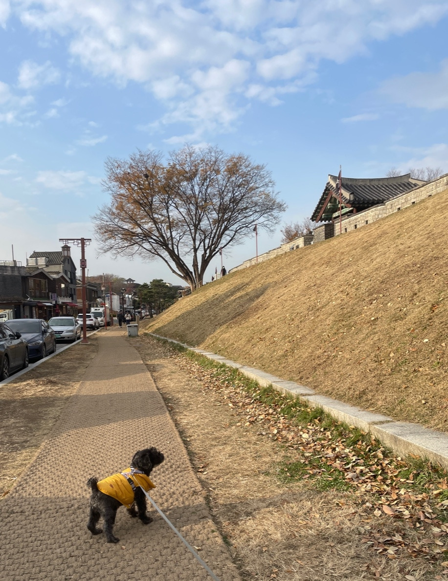 나도 완벽한 주인이 아닌지라 내가 힘들거나 마음적으로 고통받을 때, 혹은 너무 재미있는 사건이 생길 때는 까미 돌봄을 살짝 가족에게 넘기곤 했다. 그것이 한편으로는 매일 나를 고통스럽게 하는 마음 중 하나였는데, 그럴 때마다 나는 다시금 마음을 다 잡고 까미와의 시간을 값지게 보내자라는 마음으로 최근에는 주말 아침마다 까미와 산책을 나선다. 산책 위치는 주로 가까운 행궁동이다. 행궁동은 늘 교통체증과, 즐비한 사람들로 인해 동네이지만 주말 낮에는 결코 돌아다니기 싫은 동네가 되어버렸다.