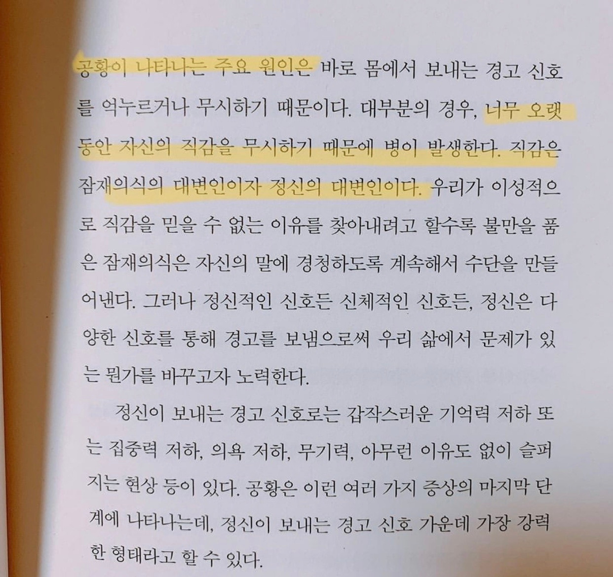 위의 책을 읽고서 망치로 뒤통수를 맞은 듯했다. 나 같은 둔한 사람에게 담담하고 정확하게 설명을 해준 글이다. 그니까 한마디로 "너는 너의 생활에서 아무런 문제가 없다고 생각할지 모르겠지만, 너 이거 지금 한번 관리하고 다시 되돌아봐. 그 시간을 보내기 위해 너의 신체에 반응을 좀 줄게. 그러니 눈치를 제발 좀 채!"라고 말하는 것이다.