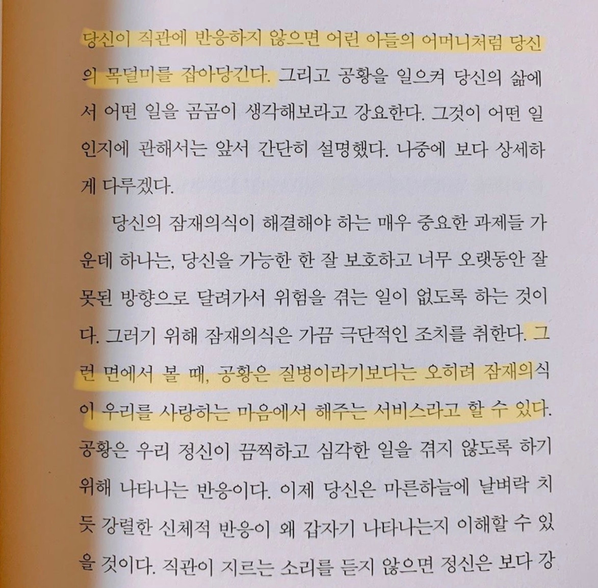 "당신이 직관에 반응하지 않으면, 어린 아들의 어머니처럼 당신의 목덜미를 잡아당긴다. 그리고 공황을 일으켜 당신의 삶에서 어떤 일을 곰곰이 생각해보라고 강요한다."