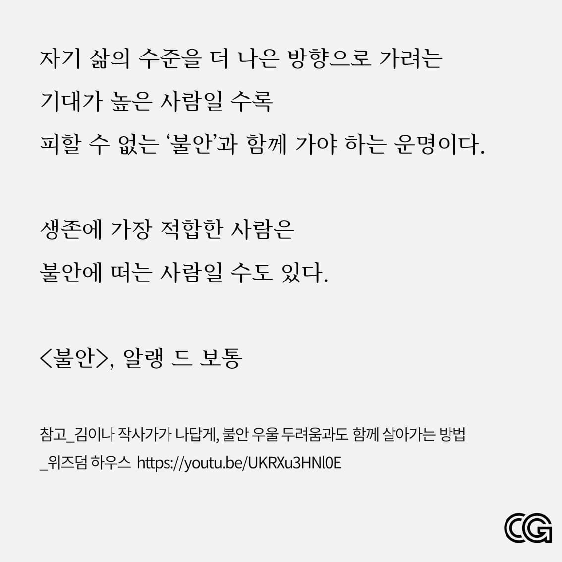 자기 삶의 수준을 더 나은 방향으로 가려는 기대가 높은 사람일수록 피할 수 없는 '불안'과 함께 가야 할 운명이다. 생존에 적합한 사람일수록 불안에 떠는 사람일 수도 있다. -알랭드보통-
