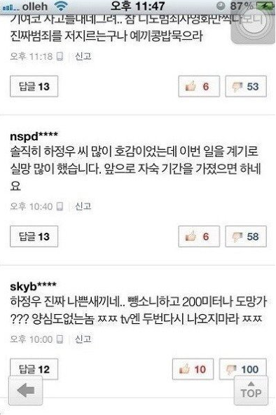 '앞으론 자숙 좀 하시고 연예계 나오셔야 할 듯. 좋은 분인 줄 알았는데 뺑소니라니.' / '하정우 진짜 나쁜 새끼네. 뺑소니 하고 200미터나 도망가? 양심도 없는 놈, TV에 두 번 다신 나오지 마라!'...