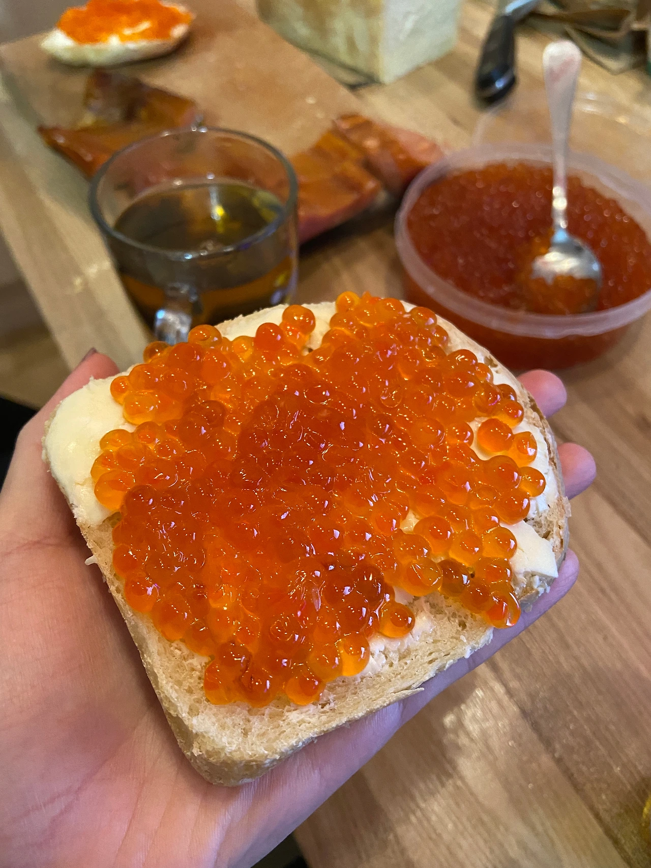 연어 알을 흑빵이나, 신선한 빵 위에 버터와 함께 먹는 것이 러시아만의 샌드위치다.