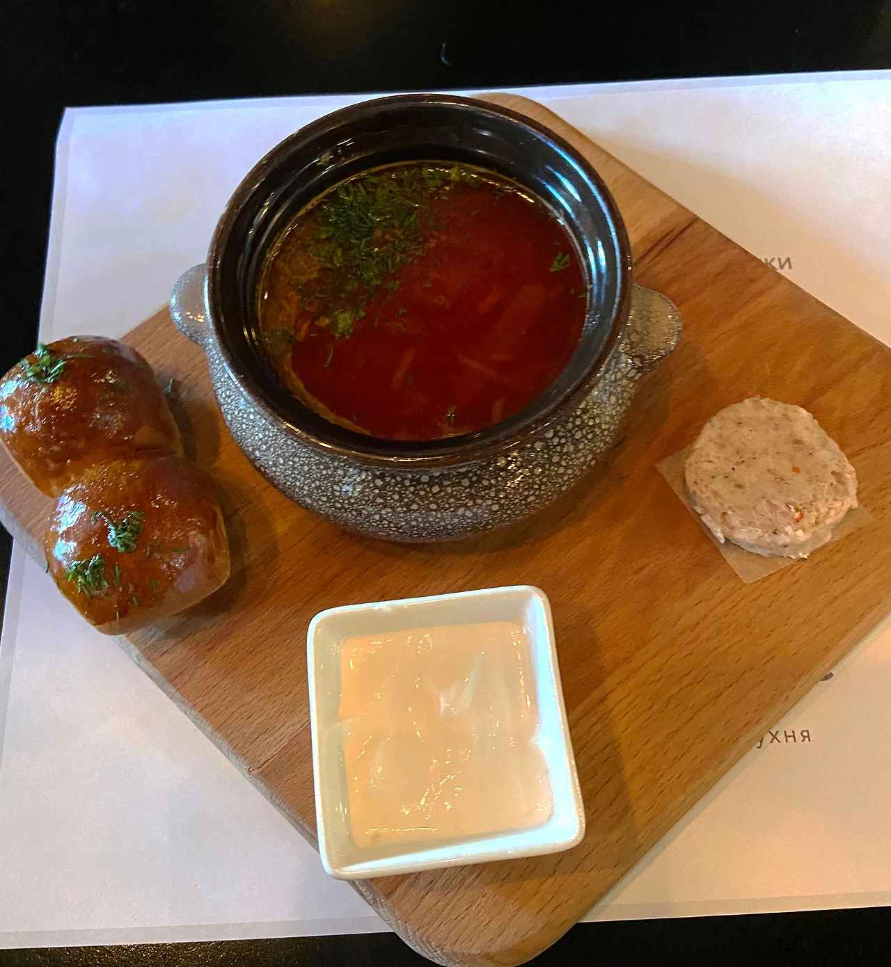 보르시는 명절이나, 겨울철 추울 때, 고속도로 등의 휴게소, 레스토랑, 푸드코드 등 정말 모든 곳에서 접할 수 있다. 보통은 맛의 차이가 없을 것 같으나... 솔직히 비싸게 파는 레스토랑이 더 맛있다. 홈메이드 보르시부터 레스토랑에서 먹는 보르시까지 다양하게 먹어봤는데, 하바롭스크 내의 가장 맛있는 레스토랑은 한 군데 였다. 식당인스타그램은 하단에 넣어놨다. 광고도 아니고 개인적으로 정말 좋아하는 곳이다. 요샌 코로나로 인해 발코니에서만 식사를 할 수 있는데, 이 식당은 예약이 풀이라.... 항상 예약하려고 전화하면 자리가 없어서 못 먹고 있다. 러시아 사람들은 대부분 샤워크림과 함께 먹지만 느끼한게 싫다면 그냥 수프 본연의 토마토 맛을 즐기는 것도 추천한다. @taki_deribas