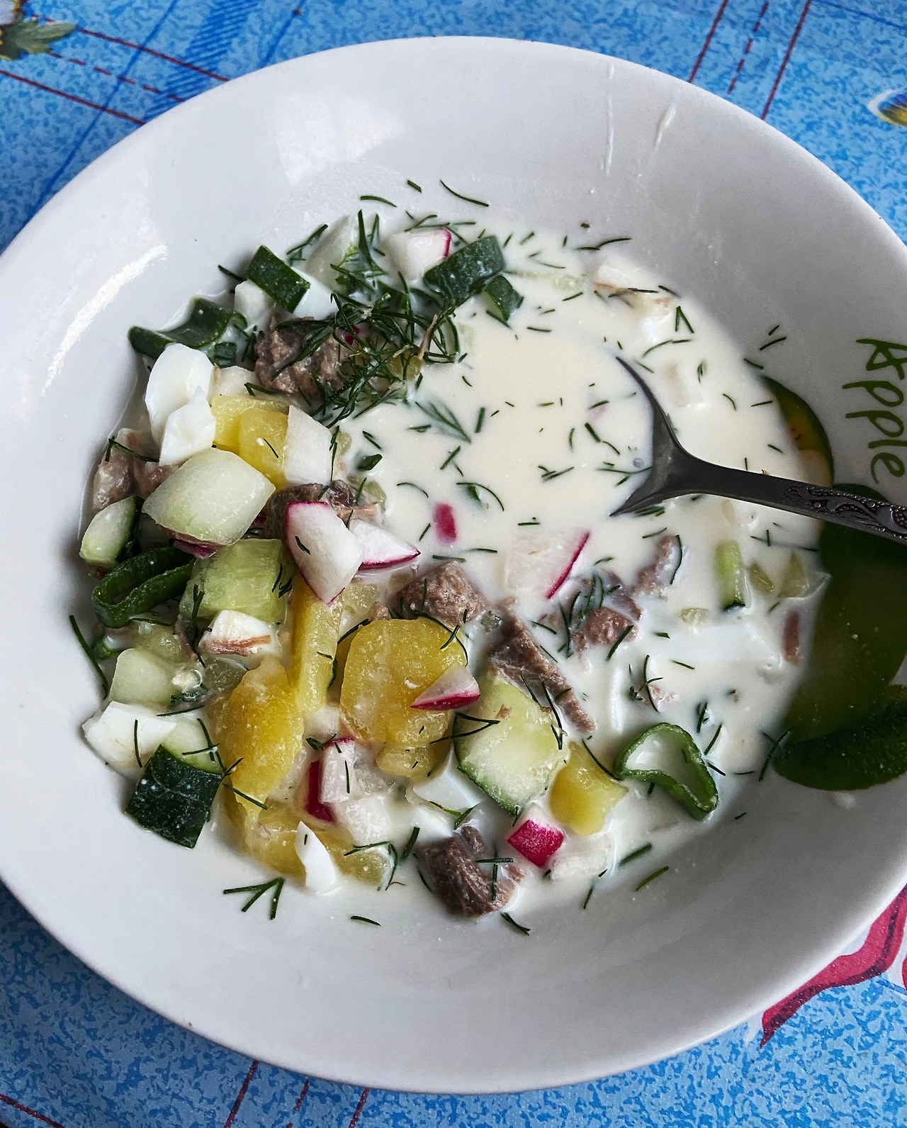 삶은 감자와 무, 오이 등 야채와 삶은 고기, 허브를 넣고 우유를 넣어 만드는 수프이다.