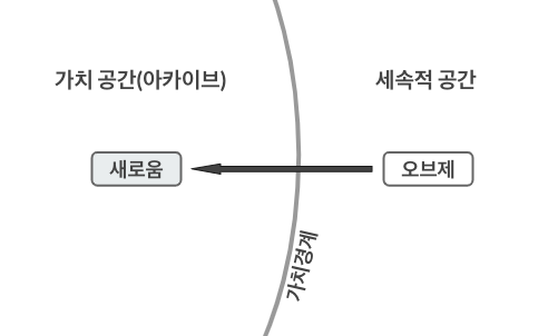 새로움은 무엇인가? 새로움은 가치가 전도되는 것이다. 가치가 없던 대상이 가치 절상되거나, 가치가 높던 대상이 가치가 절하되는 것이 새로움이다. 데미언 허스트의 작품이 좋은 예이다. 담배꽁초, 알약, 해골, 부패한 사체 등 이전에 아무도 관심 갖지 않던 대상을 가지고 작품을 제작하며 그 대상을 새로운 차원의 위치로 승격시킨다. 이 새로움을 명확히 구분하기 위해서는 이 세계의 "공간"이 어떻게 구성되어 있는지 이해할 필요가 있다. 이 세상에는 세속적 공간(무가치한 대상들이 존재하는 공간)과 문화적으로 전통적으로 아카이브 된 가치 공간이 존재한다. 그리고 이 두 공간을 구분하는 것이 "가치 경계"이다. 문화적 아카이브 공간은 이미 과거에 가치를 인정받아 차곡차곡 쌓여있는 역사와도 같은 것이다. 이런 전통적 가치들이 잘 보존되어있고, 손쉽게 접근이 가능할 때, 즉 아카이빙이 잘 되어있을 때 새로운 가치가 요구되고 그 새로움이 환영받는다. 그렇게 시대마다 새로움과 그 이전의 전통적 가치를 갖는 대상이 어떤 차이가 존재하는지로부터 새로움이 측정되고 수용된다. 그리고 그 새로움은 다시 아카이브 되어 문화적 가치 공간에 편입된다.