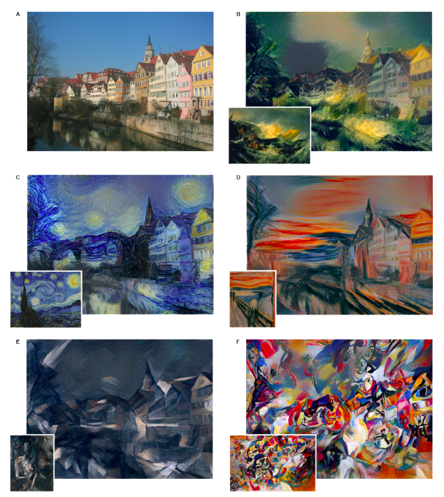 인간이 이미지 A와 각 화풍(좌측 작품사진)을 인공지능에게 전달하면 인공지능이 새로운 결과물을 생성해준다. 출처: A Neural Algorithm of Artistic Style