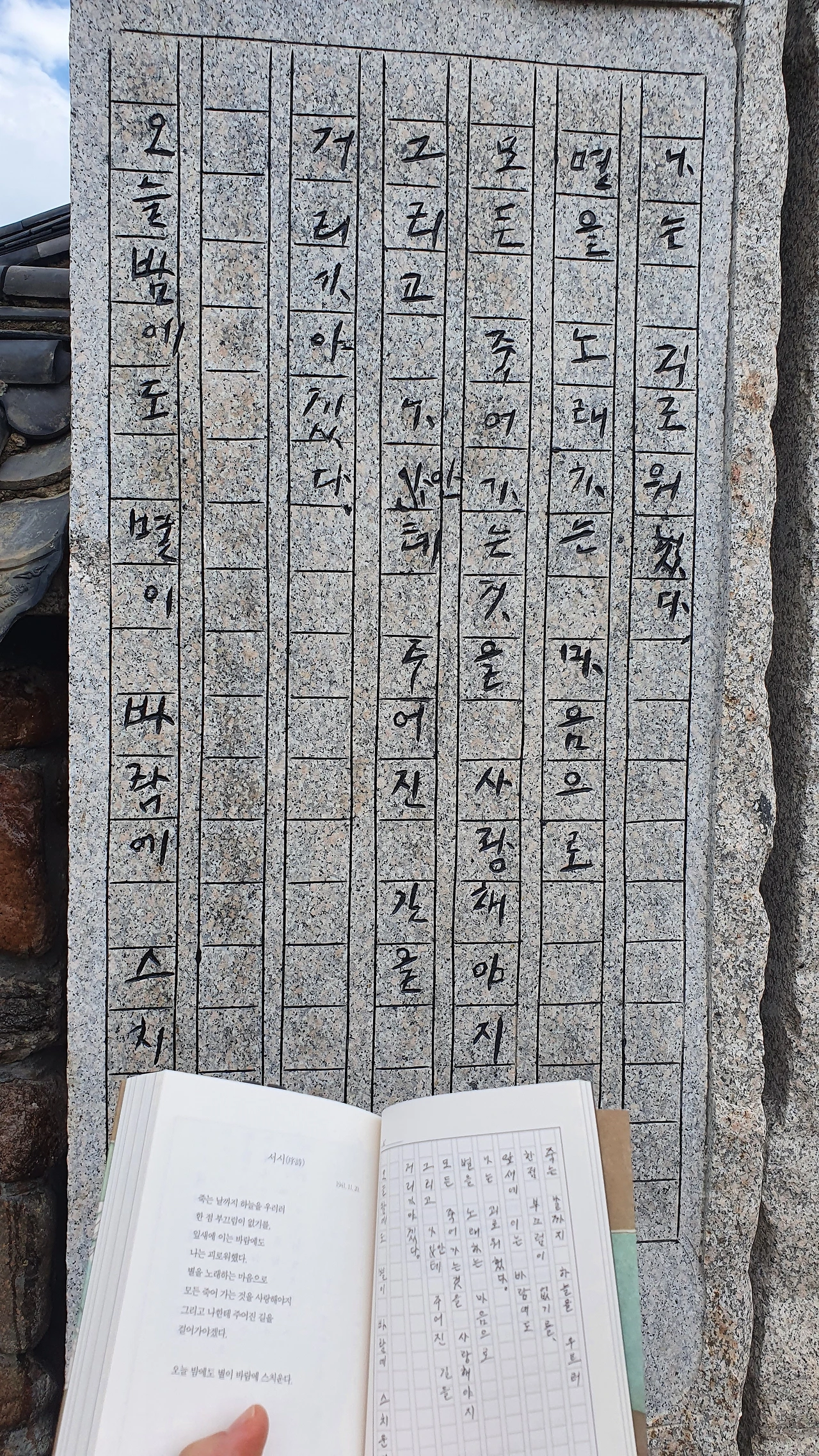 왼편에는 나의 최애 시 서시가 비석에 새겨져 있었는데 오타 지우고 다시 쓴 것도 잘 복원했지만 글씨체가 좀 다르다. 하지만 여기 사람들도 서시를 많이 사랑한다는 것이 느껴져 기분이 좋았다.