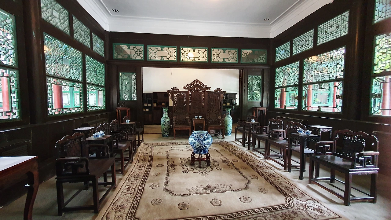 딱 중드에서 보던 고관대작의 응접실이다. 천장이 높고 나무 의자가 딱딱하고 고풍스럽다. 가운데 큰 도자기가 포인트.