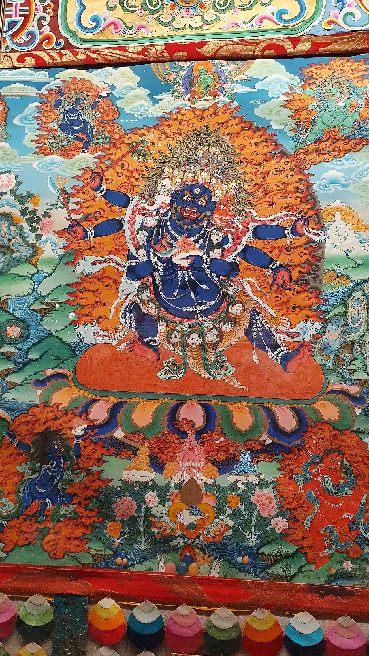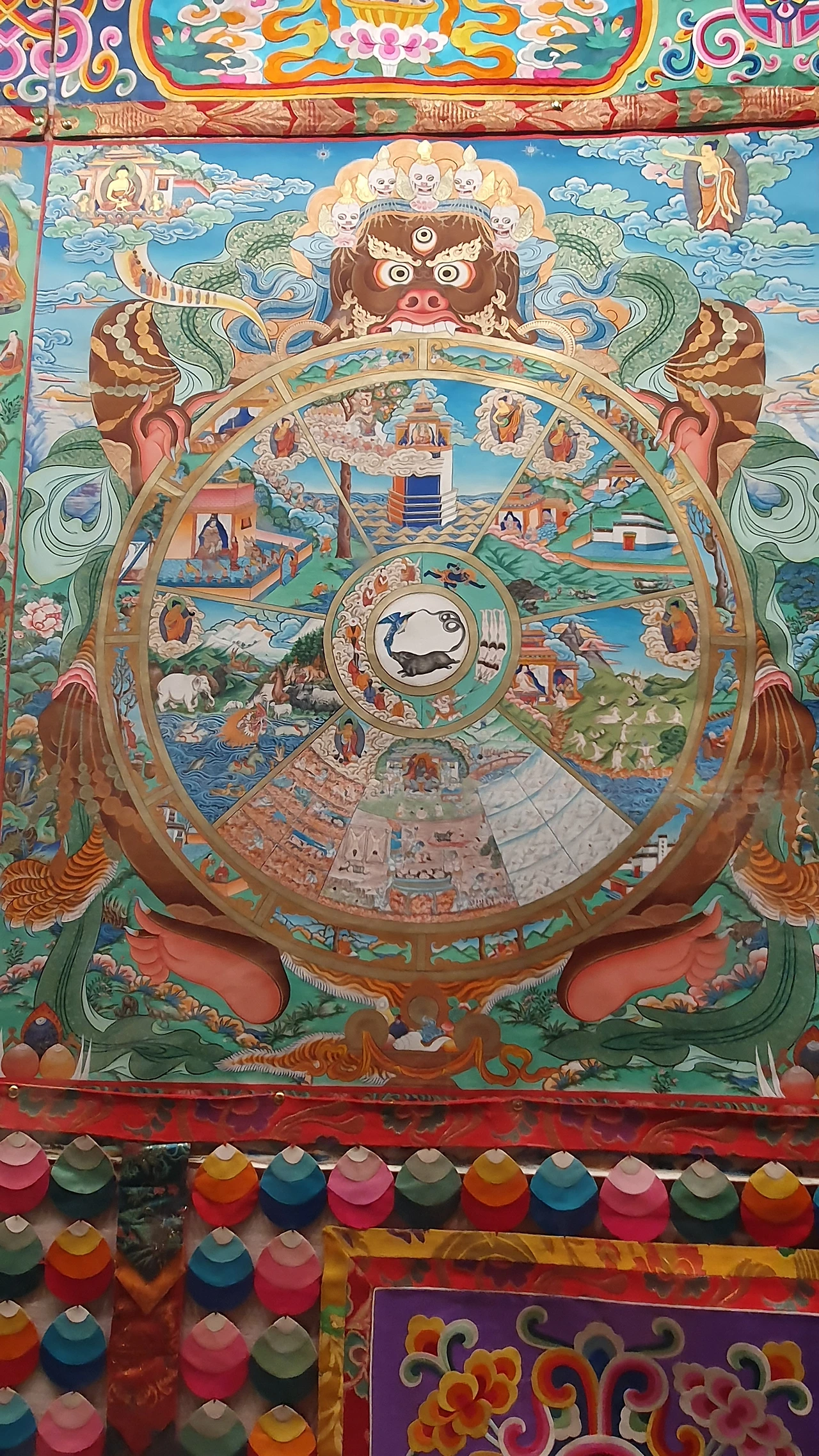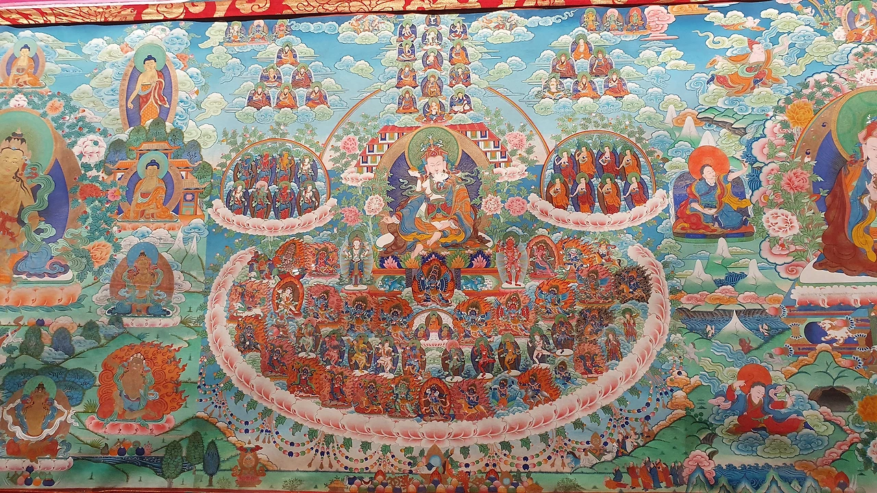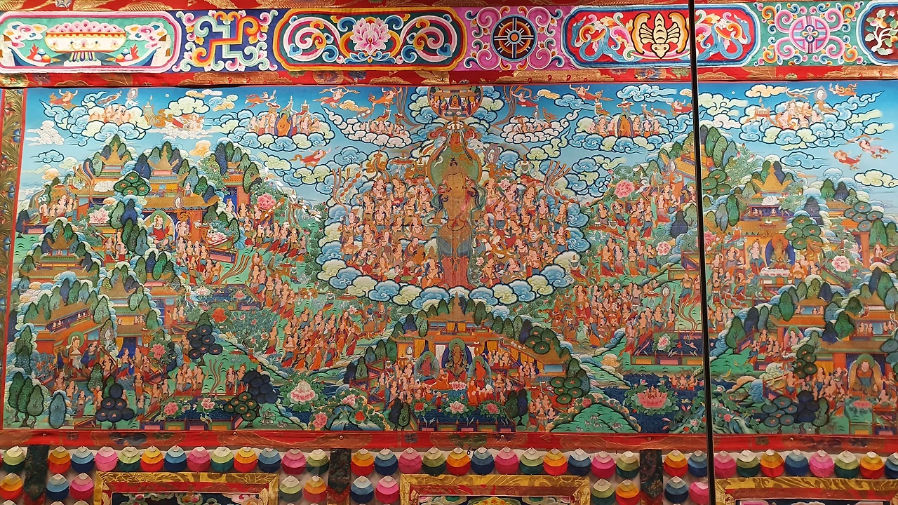 그림의 종이가 이어 붙인 흔적이 없어서 놀랐다. 비교적 최근 그린 것 같은데 그 섬세함과 화려함에 경탄하며 구경했다. 불교 세계와 현실 세계, 그리고 티베트의 의학과 희로애락, 역사적 인물까지 생생하게 담겨 있다.