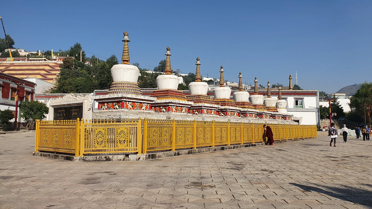 석가모니의 8가지 덕목을 상징하는 고탑이다. 사람들이 주위를 돌며 기도하는 모습이 보인다.