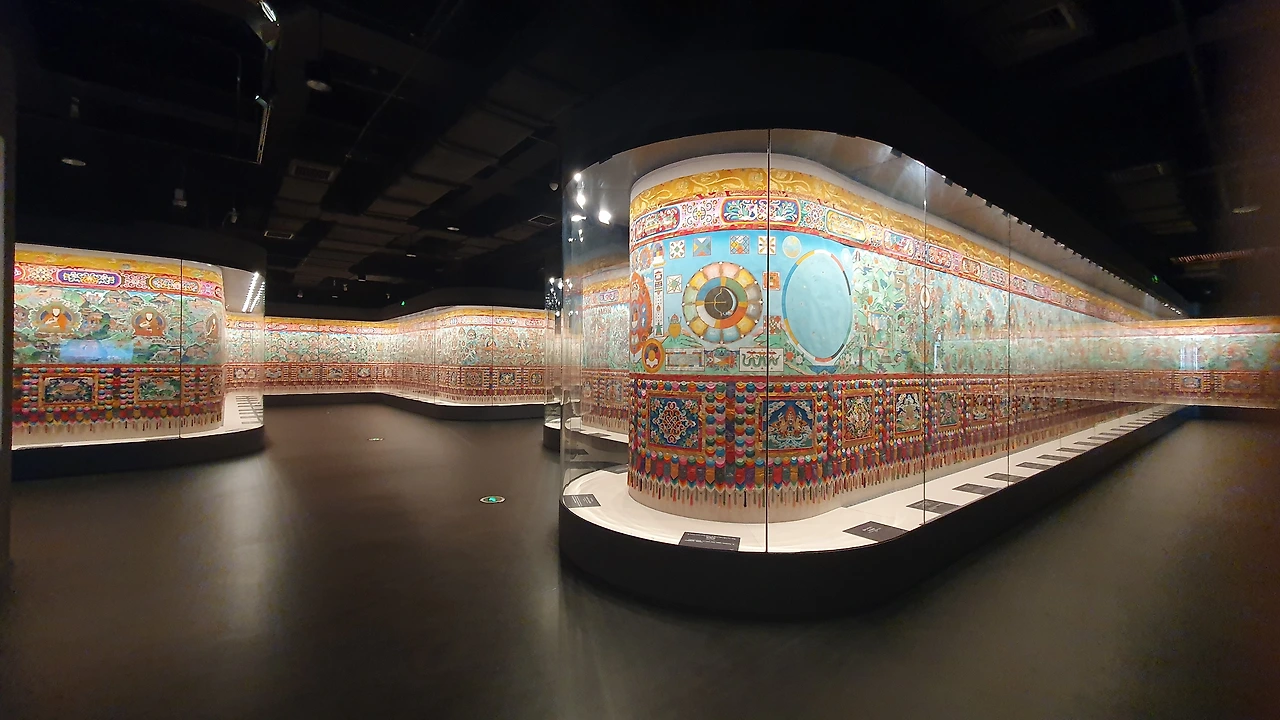 시닝의 티베트 박물관은 남쪽과 북쪽 건물 2개인데 남쪽은 무료이고 북쪽은 60위안이다.(사실 어는 쪽이 유료이고 무료인지 기억이 또렷하지 않다) 나는 유료 건물부터 들어갔다. 4층부터 보았는데 구불구불한 벽에 전시된 그림은 끝이 보이지 않을 정도로 어마어마하다.