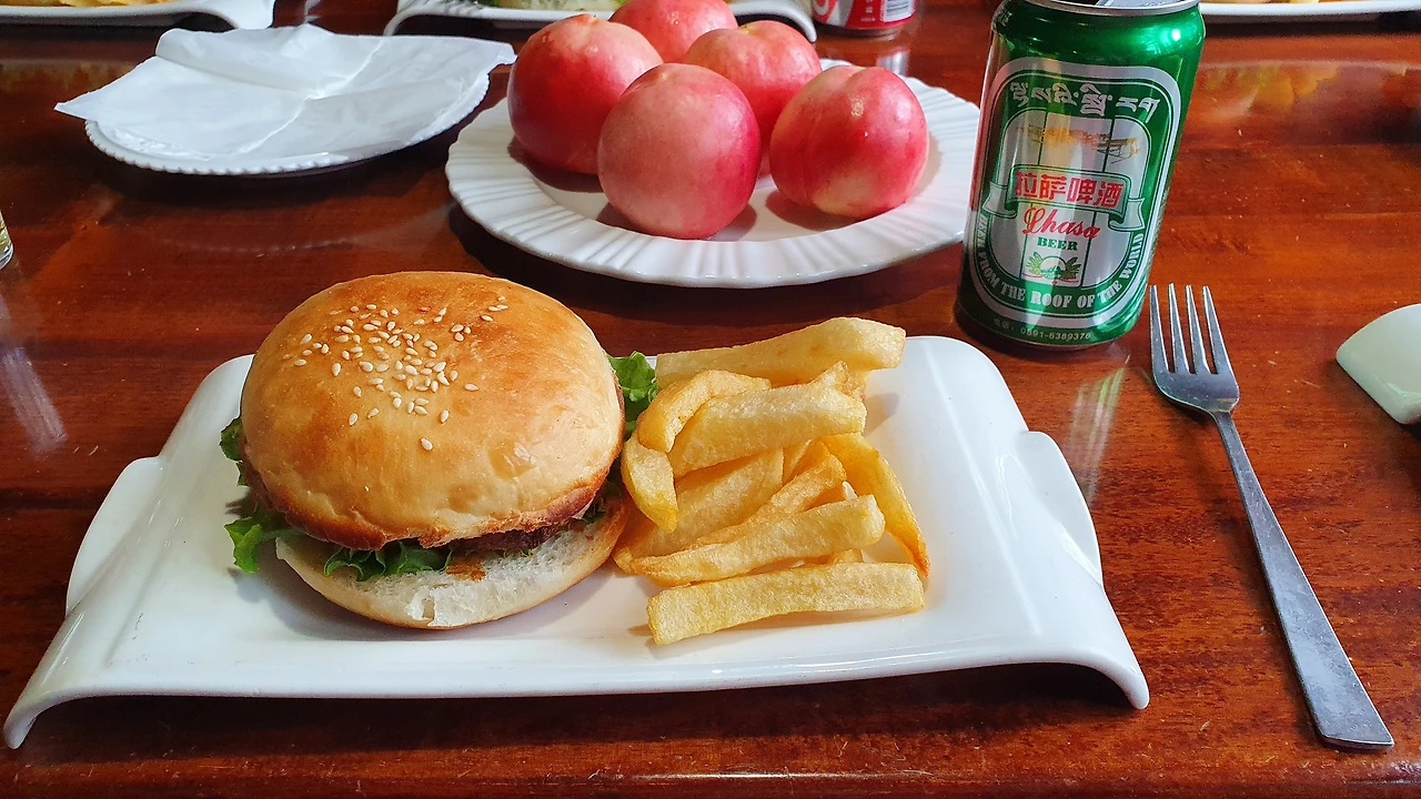 티벳 맥주와 야크 버거그 유명한 야크 버거도 먹었는데 고기를 못 먹어서 아쉬웠다. 하지만 감자칩은 무척 맛있었다.