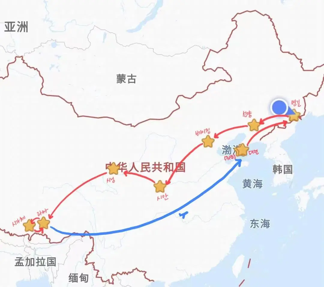 동쪽 끝에서 서쪽 끝으로 열심히 달리며 많이 보고 느끼고 즐거운 22일이었다. 지도에 여정을 찍어보니 한국이 참 가깝게 느껴진다. 언젠가 열차로 서울에 출발하여 시가체에 닿을 날이 오면, 물론 에베레스트는 사절이지만, 그런 날이 오면 좋을 것 같다.