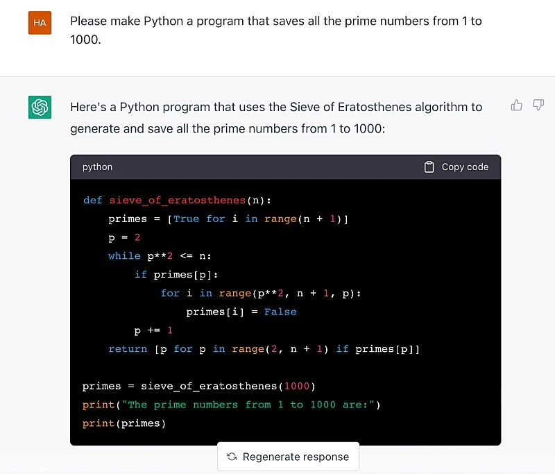 소수(Prime number)를 구하는 방식은 약수를 개수가 2개인 자연수를 구하는 방식과 에라토스테네스의 체를 구하는 방식이 있다. 중학교 때 배우는 것인데 처음 문제를 풀 때는 대부분 전자의 방식으로 풀다가 시간 초과 에러를 내곤 한다. 가장 효율적인 방식은 에라토스테네스의 체로 구하는 방식인데 나도 진짜 어렵게 어렵게 풀은 문제였다. 그런데 GPT는 망설임도 없이 후자의 방식으로 3초 만에 코딩을 완성하였다. (그리고 나는 좌절했다.)