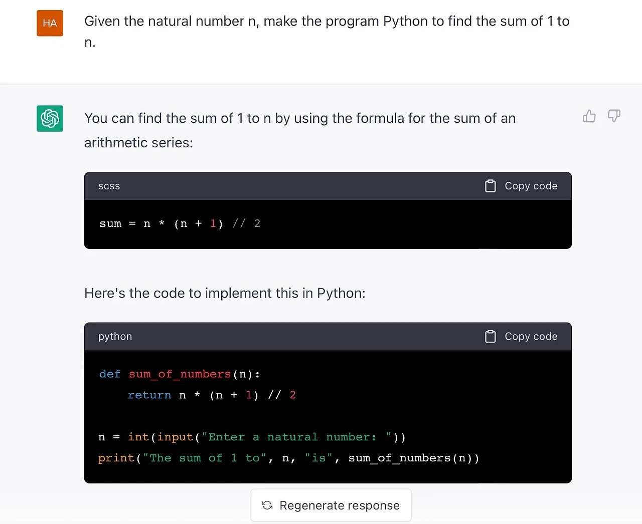 sum = 0으로 두고 for문 돌리는 건 하수고, 가장 좋은 건 가우스 공식을 이용하는 것인데 GPT는 단번에 후자를 이용하였다. 단순히 답을 외운 것인지 메타인지가 있는 것인지 헷갈리기 시작했다.