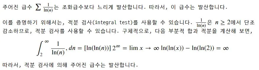 맞다. \sum{1/n}을 기준으로 급수의 수렴과 발산을 판정하는데 \sum{1/ln(n)} > \sum{1/n} -> \inf 이므로 그렇게 된다. 적분 검사로 발산 증명하는 것도 맞다.