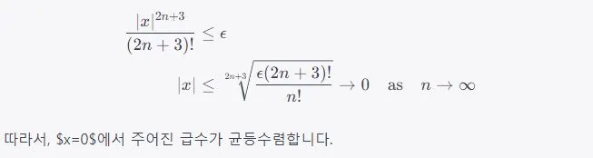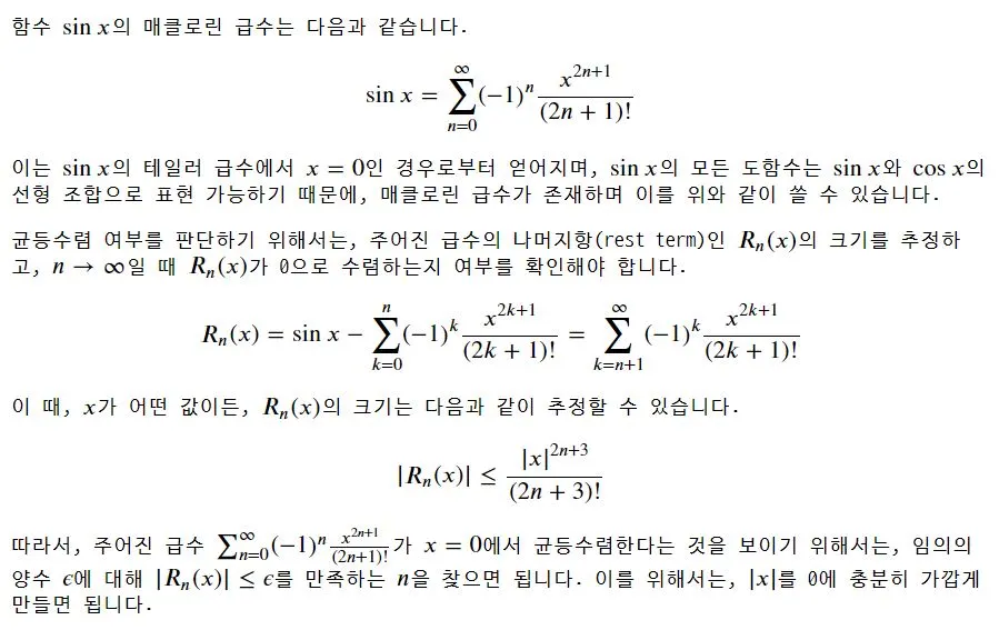 직관적으로도 수렴이 당연하지만 매클로린 급수를 구하고 그것의 n번째 나머지를 구해서 판정할 줄 아는지 궁금했다. 결론은 매우 잘한다. 매우 매우...