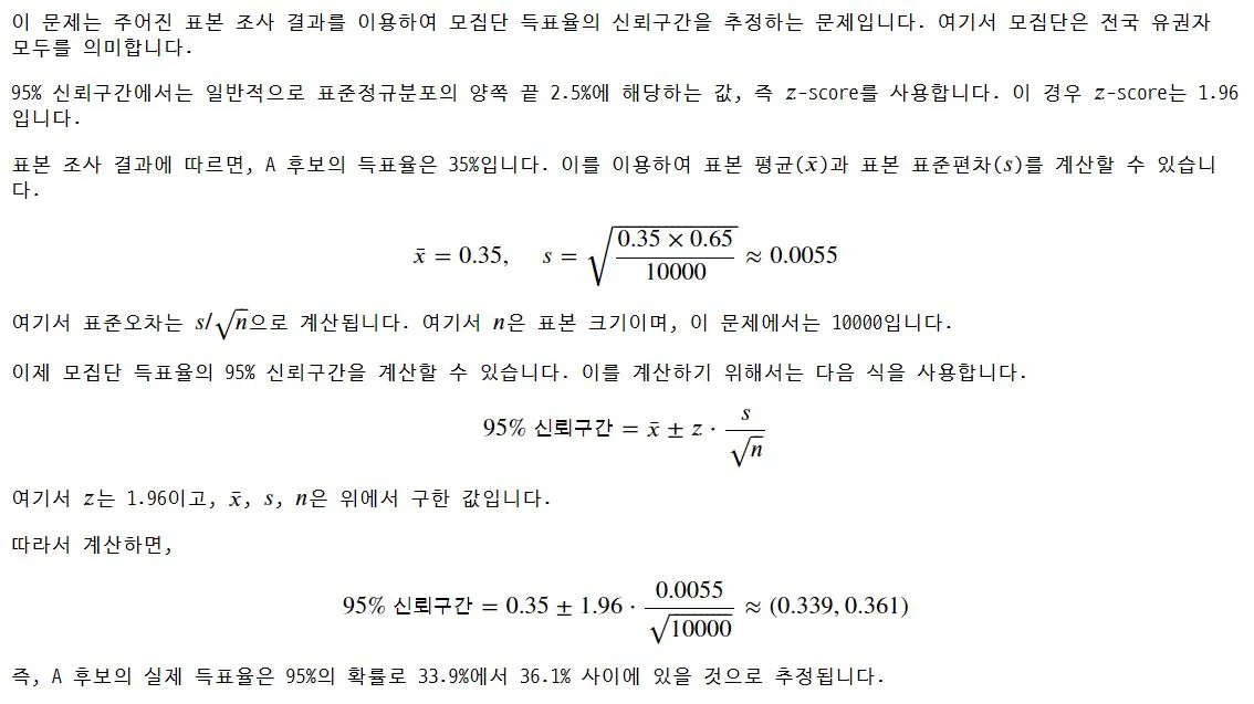 통계의 신뢰구간 추정 문제인데 이건 공식화되어 있어서 무척 쉬울 거라 생각했다. 아니나 다를까 너무나 잘 풀었다. 심지어 풀이도 완벽하다. 수식은 LaTex로 적혀서 주피터 노트북에 붙여서 텍스트로 변환하면 풀이집으로 이용 가능할 정도이다. 라텍스 수식이 익숙하지 않은 분들을 위해 주피터 노트북으로 변환하여 붙인다. 꼭 주피터 노트북 이용할 필요는 없고 Markdown을 지원하는 편집기에 붙이면 잘 파싱해준다.