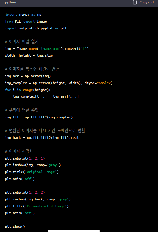 위 코드에서는 Pillow 라이브러리를 사용하여 이미지 파일을 열고, numpy 라이브러리를 사용하여 푸리에 변환을 수행하였습니다. 결과 이미지는 matplotlib 라이브러리를 사용하여 시각화하였습니다.