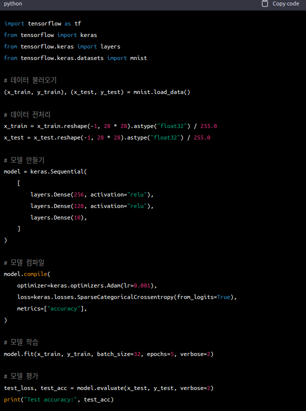 위 코드에서는 TensorFlow와 Keras를 사용하여 MNIST 데이터를 로드하고, 데이터를 전처리한 후, 여러 개의 레이어로 구성된 신경망 모델을 만들고, 이를 컴파일한 후에 학습시켰습니다. 학습이 끝나면 모델을 평가하고, 정확도를 출력합니다.