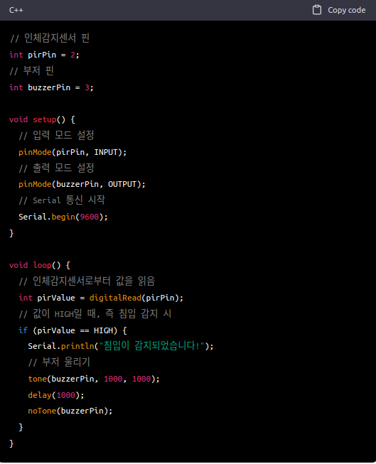 위 코드에서 pirPin과 buzzerPin은 사용자가 연결한 실제 핀 번호에 맞게 변경해야 합니다. 또한, 침입이 감지될 때마다 Serial 통신을 통해 메시지를 출력하도록 되어 있습니다. 이 부분은 필요에 따라 삭제하거나 변경할 수 있습니다.