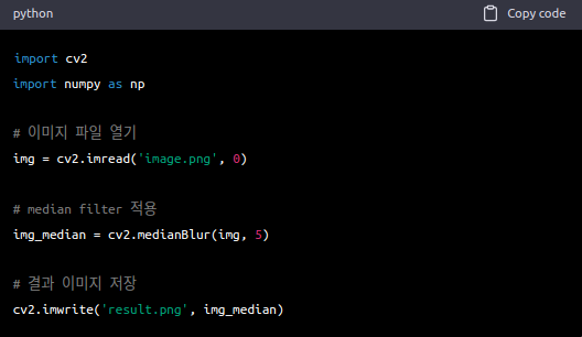 위 코드에서는 cv2.imread() 함수를 사용하여 이미지 파일을 열고, cv2.medianBlur() 함수를 사용하여 median filter를 적용합니다. 이 함수의 두 번째 인자는 필터 크기입니다. 이 예제에서는 5x5 크기의 필터를 사용하였습니다.