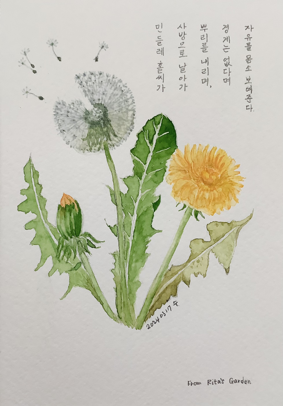 생각보다 그리기 어려웠던 민들레 홀씨. 여러 번 그리다 망치고 붓으로는 섬세한 작업이 어렵다는 결론, 결국 사인펜을 이용하였다.