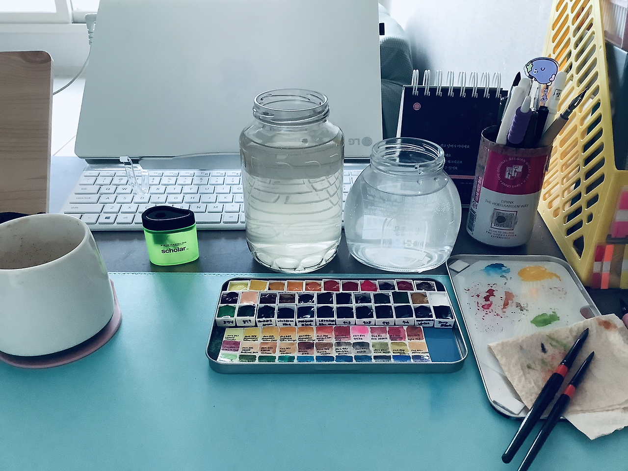 내 브런치를 보면 콘텐츠에 따라 아날로그와 디지털의 극과 극을 볼 수 있다. 하나는 인공지능이나 컴퓨터 기술, 또 하나는 시와 수채화 그림. 책상도 비슷해서 디지털 기기들과 아날로그 도구들이 상존하고 있다.