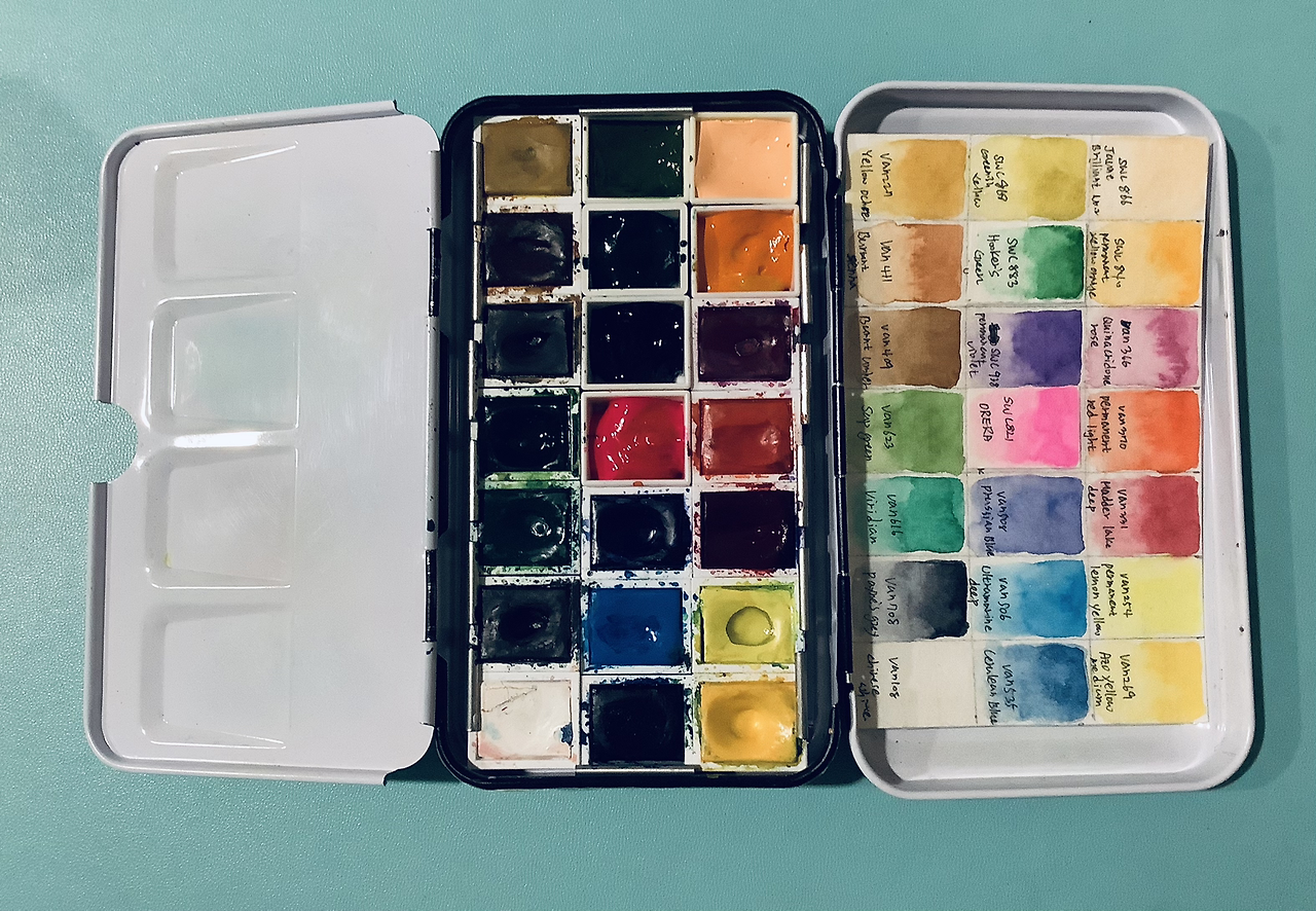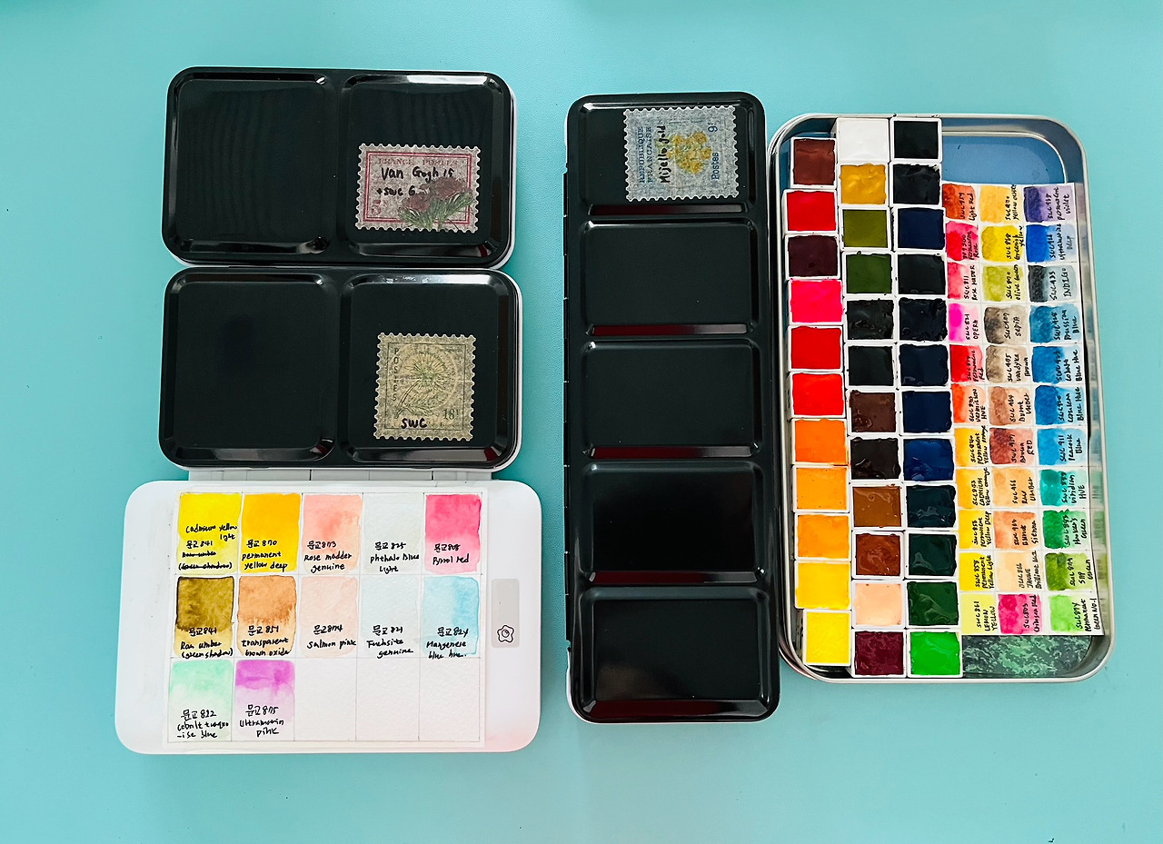 물감이 요즘 자가증식하는 것 같아 심히 우려스러운데, 본인이 현재 가진 물감은 반 고흐, 신한 SWC, 미젤로 미션골드, 문교 노스탤지어 이렇게 4가지 종류이다. 팔레트가 하나 더 많다고 생각하겠지만, 하나는 트래블용 신한 SWC를 짜놓은 거라서 총 4가지가 맞다.