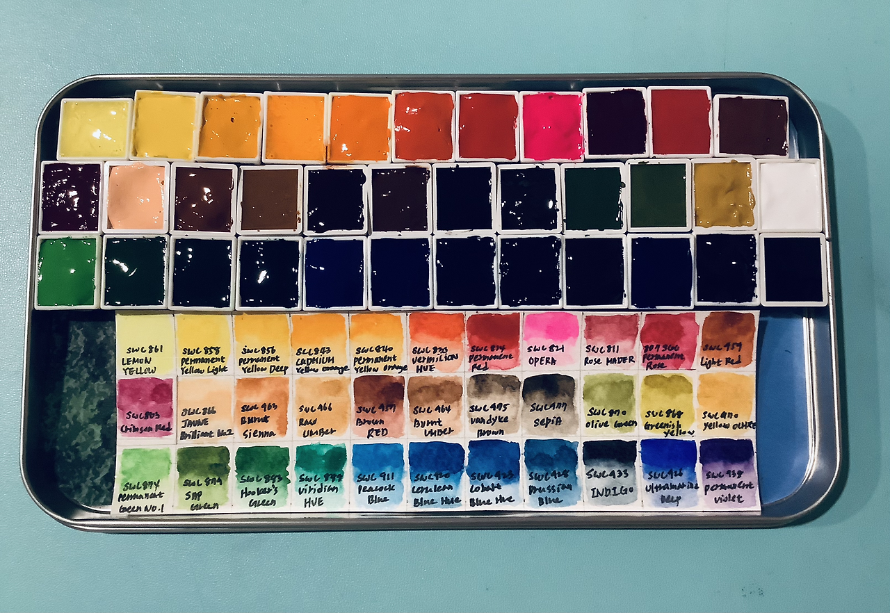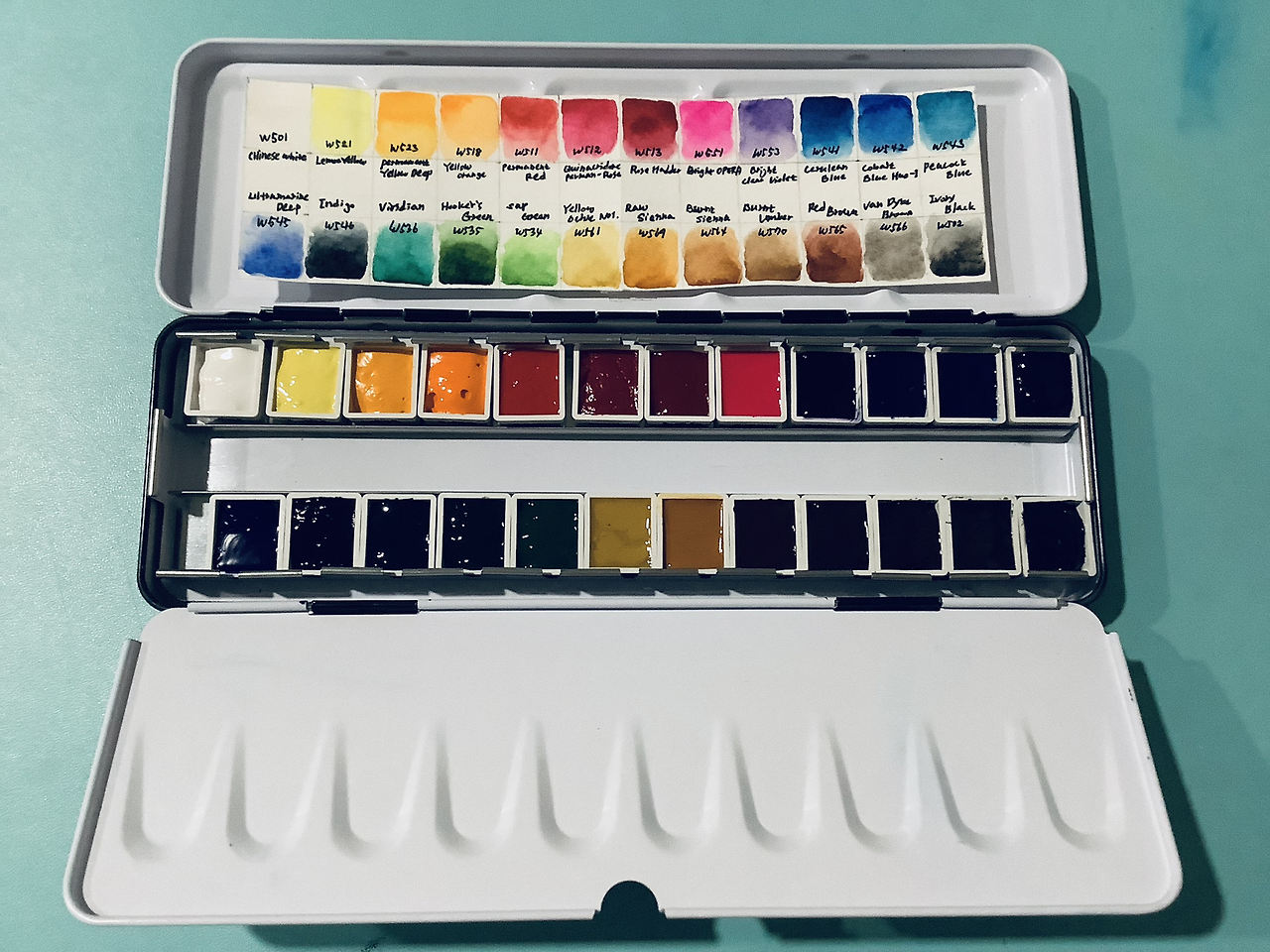 참고로 진짜 전문가들은 흰색과 검은색 물감은 절대 사용하지 않는다고 하는데, 본인은 전문가가 아니라서 색 3개(화이트, 블랙, 살색) 더 추가해서 35색으로 팔레트를 구성했다. 이 물감과 함께 강의를 들으면 웬만한 색상은 모두 들어 있어서 수채화 공부하기 정말 좋은 것 같다. 이제 좀 제대로 수채화에 빠져 볼까 하는 분들에게 신한 SWC 추천한다.