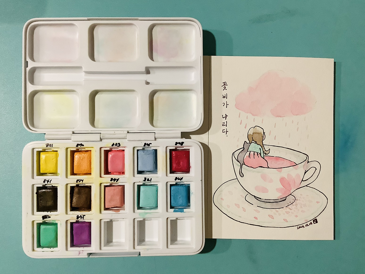 파스텔톤은 흰색을 섞어 조색하면 되는데 색이 탁해지기도 하고 일관된 색을 조색하기가 쉽지 않다. 그래서 틴트 물감을 사는데 대체로 가격이 사악하다. 문교에서 매우 저렴하게(1만 2천 원) 나와서 좋기는 한데 틴트가 아닌 계열의 색도 있어서 뭐지스럽다.(갈색이나 노란색 계열) 하지만 대체로 색도 예쁘고 유용하게 잘 사용하고 있다. 게다가 발색도 준수하고 물에 잘 풀어져서 수채화 입문용으로 괜찮은 것 같다. 일반 12색 물감도 1만 원 안쪽으로 살 수 있으니 어반 스케치용으로 틴케이스 물감이 필요하면 추천한다.