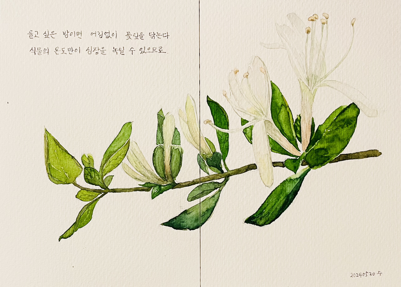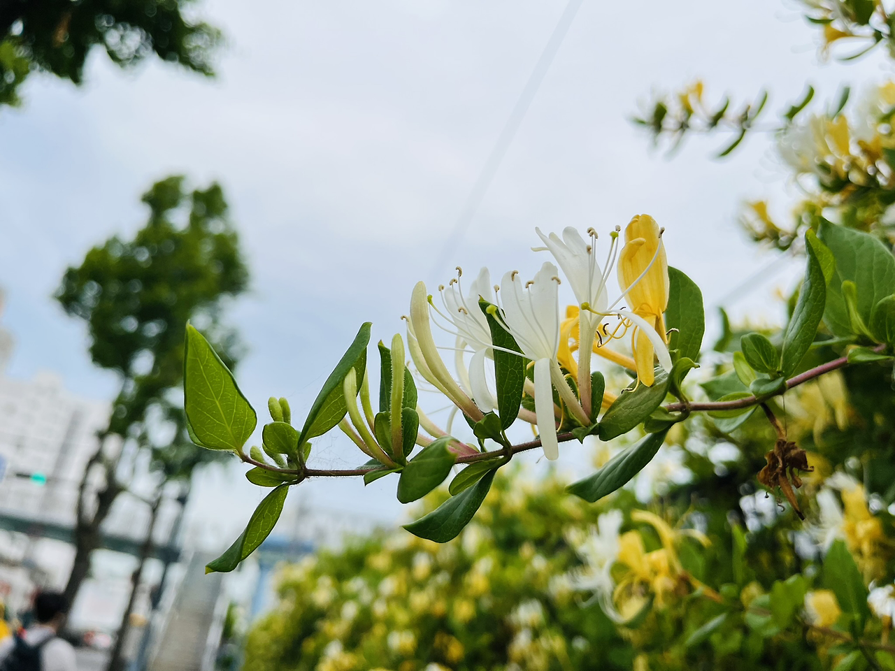 검색해 보니 노랗고 하얀 이 꽃은 인동꽃 혹은 금은화라고 한다. 금은방울 전래 동화에 나오는 그 방울꽃인가 그런 시덥지 않은 생각을 했다. 출근길에 금은보화는 아니지만 그래도 금은색 반짝반짝한 꽃을 만나서 좋았다.