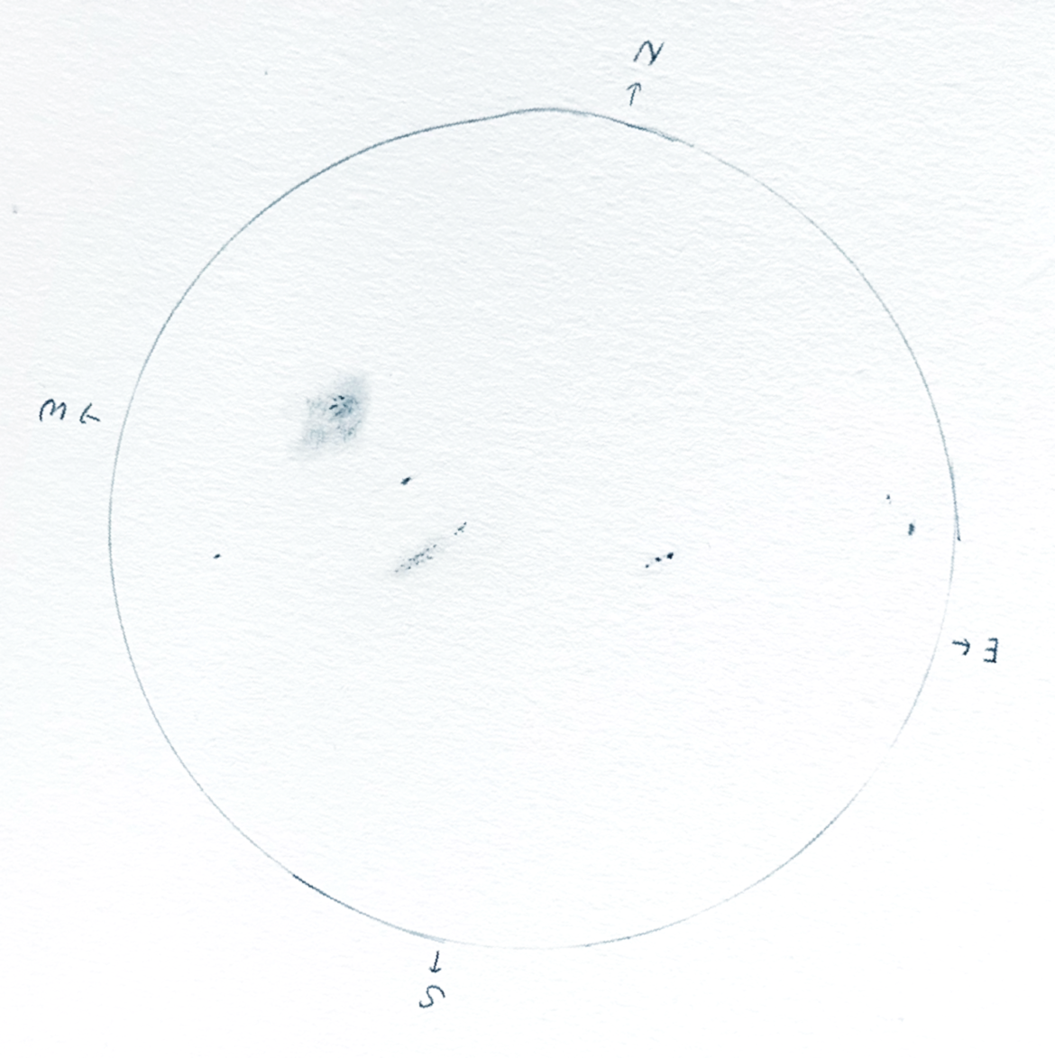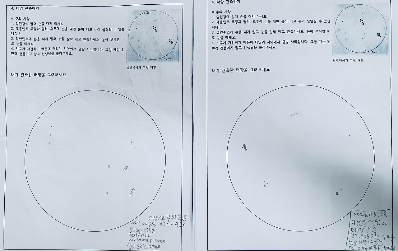 태양 관측 앞에서 프로 예민러 상태라 아이들이 떠드는 걸 미연에 방지하기 위해 관측일지도 쓰게 시켰다. 엉성하지만 나름 위치는 정확한 것 같다. 엄청 잠깐씩만 보았을 텐데 기특하다.