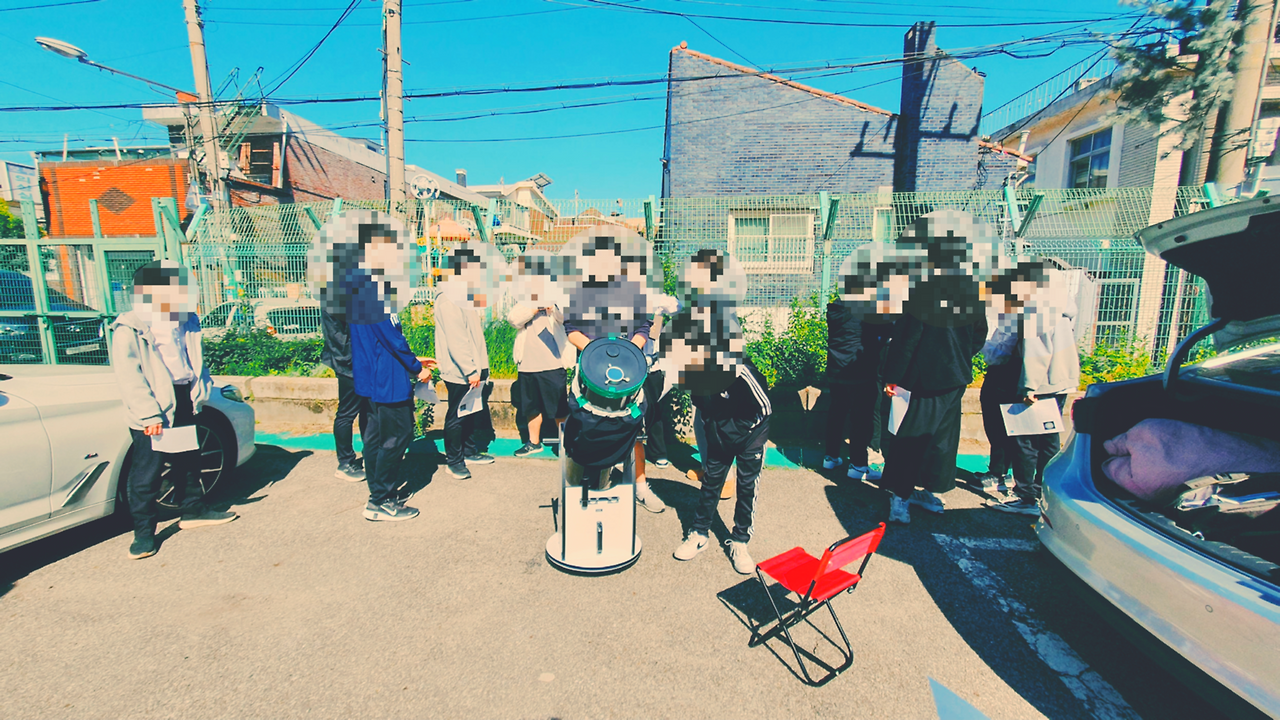 태양을 보여준다고 해서 ‘이글이글 타오르는 해야’를 기대했는데 흰색 동그라미에 점 조금 찍힌 태양을 보고 실망한 아이들도 있고 처음 망원경으로 천체를 보아서 신기한 아이들도 있었다.