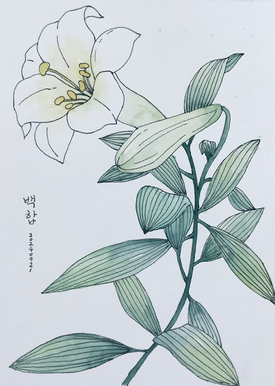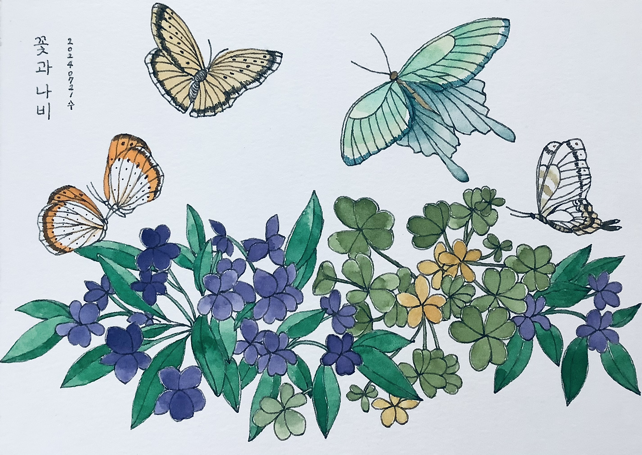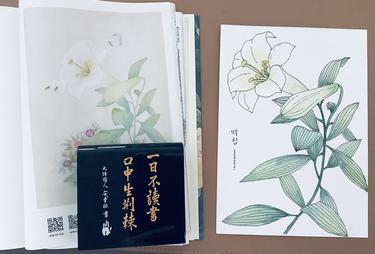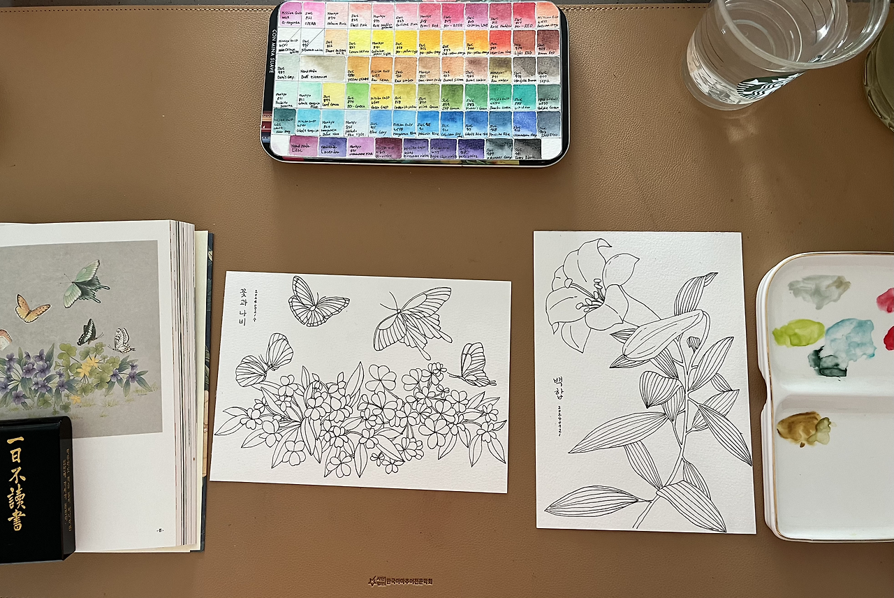 평소에 그리는 만화풍도 아니고 수채화풍도 아닌 익숙한 듯 묘한 매력을 지닌 도안들을 따라 그리다 보면 시간이 잘 간다. 연수 강의 하나 틀아 놓고 연필선을 딴 후 방탄 잉크를 넣은 만년필로 선을 따준다.