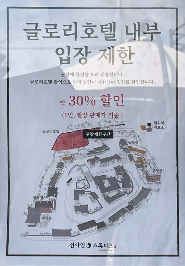 입구에 들어가면 바로 글로리 호텔이 보인다. 내부가 접근 불가이지 외부는 얼마든지 볼 수 있다. 글로리 호텔은 대한 제국 시절 손탁 부인이 운영하던 손탁 호텔을 모티프로 하고 있다.