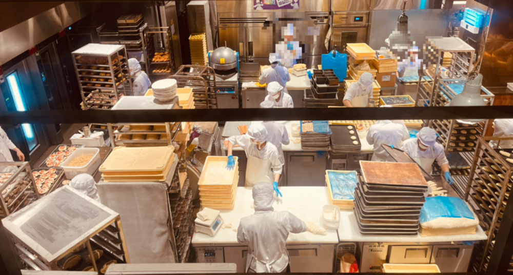 2층 카페에서 시루 때문에 대기 줄에 선 후 빵줄에 다시 선 일행을 기다렸다. 카페 유리창 아래로 제빵사 분들의 분주한 손놀림이 보인다.