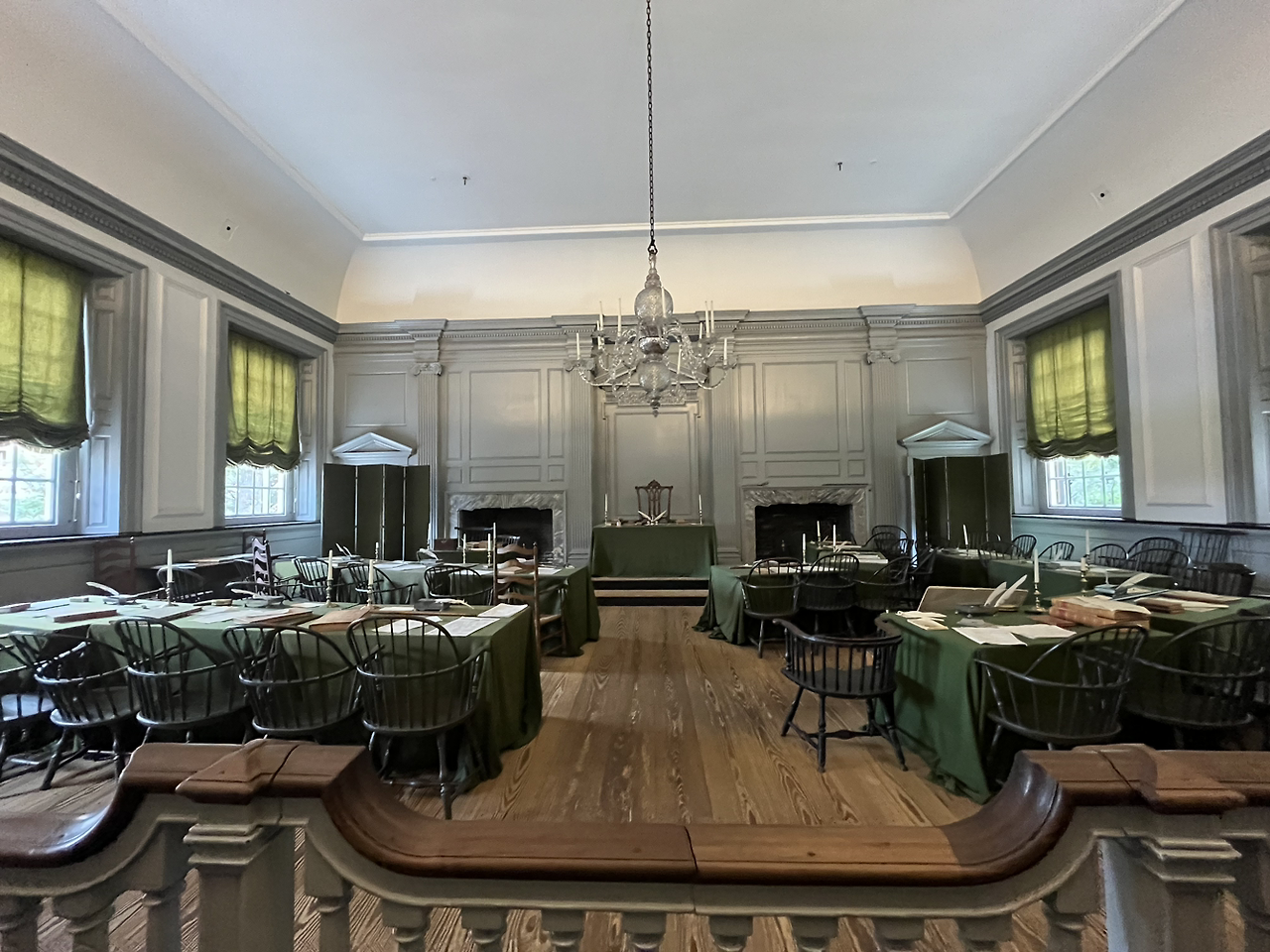두 번째 방은 미국의 독립선언서와 헌법이 만들어진 장소라고 한다. 다양한 시청각 자료들이 동원되어 당시 참석했던 역사적 인물들과 견해와 토론들, 그리고 미국 자유와 독립에 대해 설명해 주셨는데 여기서는 사실 단어가 어려운 게 많아서 반 밖에 못 알아들어 아쉬웠다. 가운데 상석은 미국의 초대 대통령 조지 워싱턴이 앉았던 자리인데 이곳에 Sun Raise 문양이 있다고 가이드가 열심히 설명하였는데 ’ 그게 대단한 의미인가?‘했다가 나중에 프랭클린 박물관에 가서 그 의미를 깨달았던 것 같다.